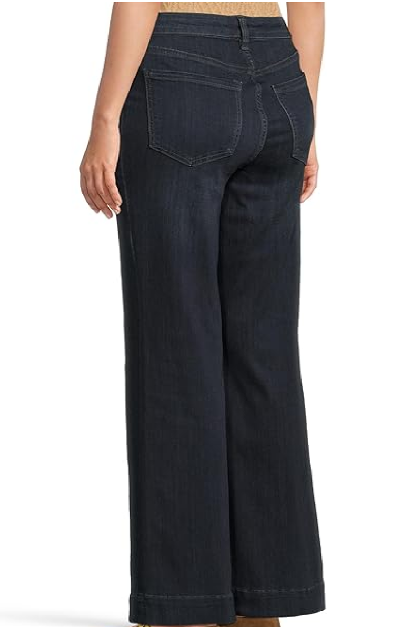 A classic bootcut silhouette with a modern wide hem, the Wide Hem Lucy Bootcut Jean is cut from dark denim with subtle whiskering at the hips. These Liverpool jeans sit at a mid rise and flare gently from the knee for balanced, wearable movement. The deep indigo wash and clean finish make them easy to dress up or down for everyday wear. Pair them with sandals or heels to show off the wide hem and elongating shape.