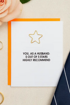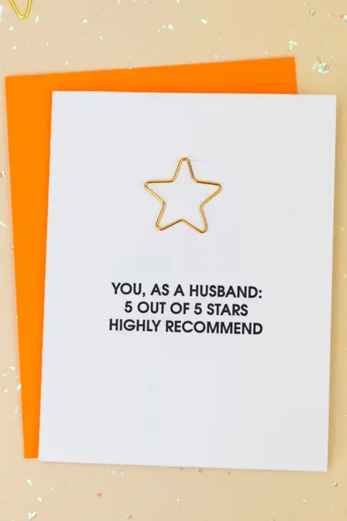 Letterpress printed on a vintage printing press, the design includes a heavy-duty gold star paper clip that doubles as a gift card or cash holder inside. Afterward, the paper clip can be reused as a bookmark, wine charm, or classic desk accessory. A fun and functional way to celebrate your five-star husband!