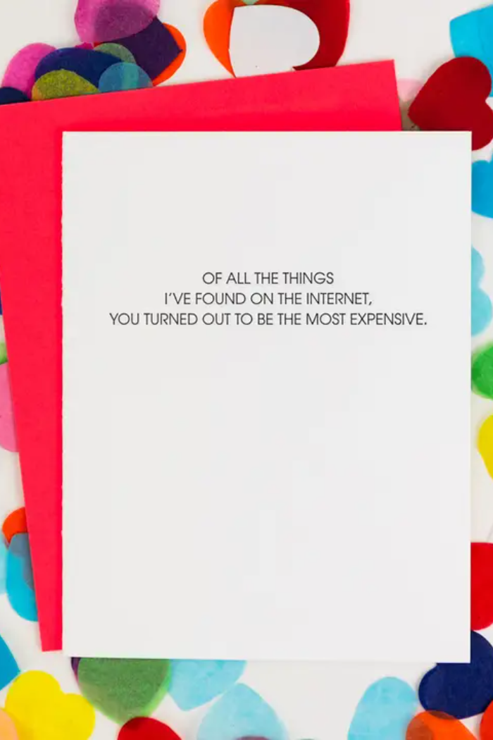 Our “Of All The Things I’ve Found on the Internet, You Turned Out to Be the Most Expensive” card is the perfect mix of humor and love for relationships that thrive on sarcasm. Whether it’s an anniversary, Valentine’s Day, or just a “because I love you” moment, this funny love card says what everyone’s thinking—with the signature Chez Gagné wit. Great for couples who embrace the chaos, laugh together, and maybe argue about who racks up the bigger Amazon cart.