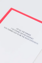 Letterpress printed on a vintage printing press in sunny California, this premium-quality card is printed on bright white, tree-free 100% cotton paper. It comes paired with a bold neon red envelope to make sure your message lands with impact. Blank inside so you can add your own personal punchline (or apology, depending on how much you’ve spent online).