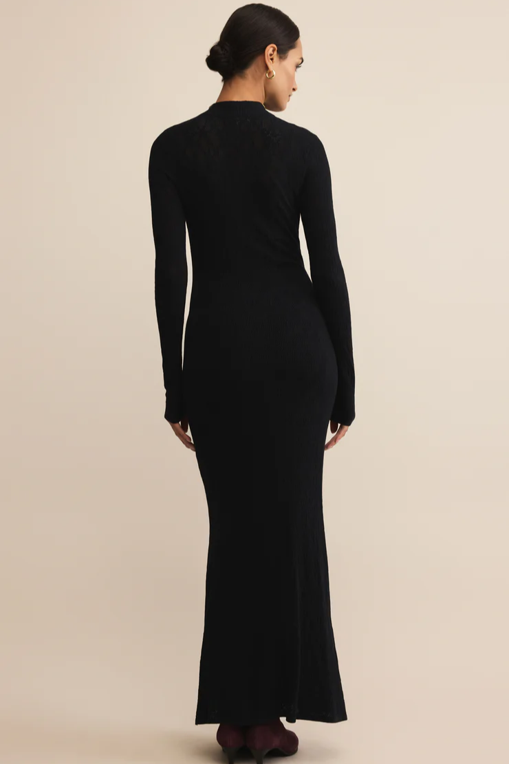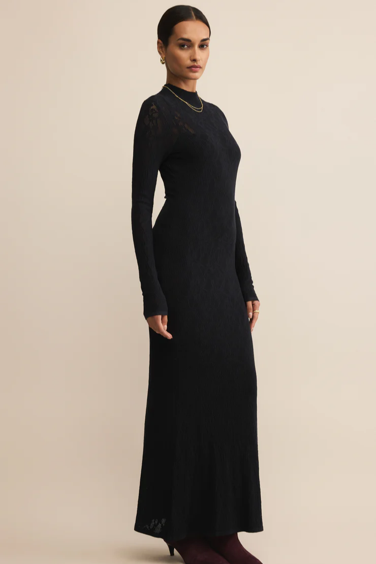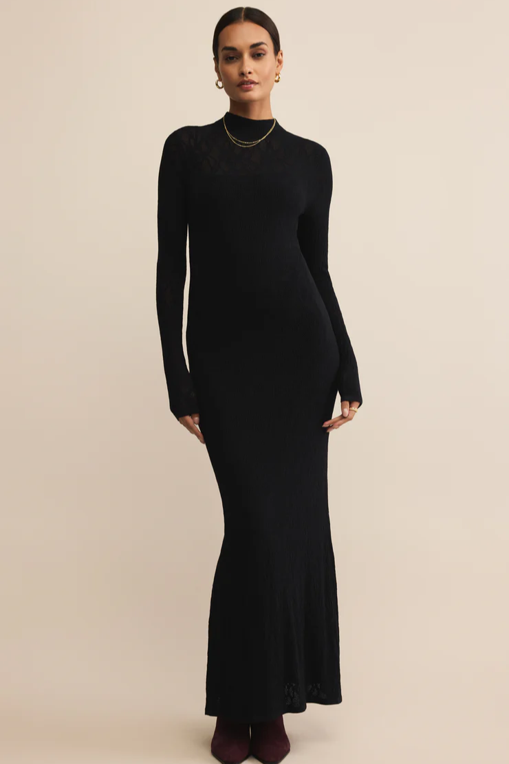 This lace maxi knows how to make an entrance. With a body-skimming fit, airy knit texture, and a mock neck to balance the long sleeves, it’s that rare mix of refined and relaxed in all the right ways.