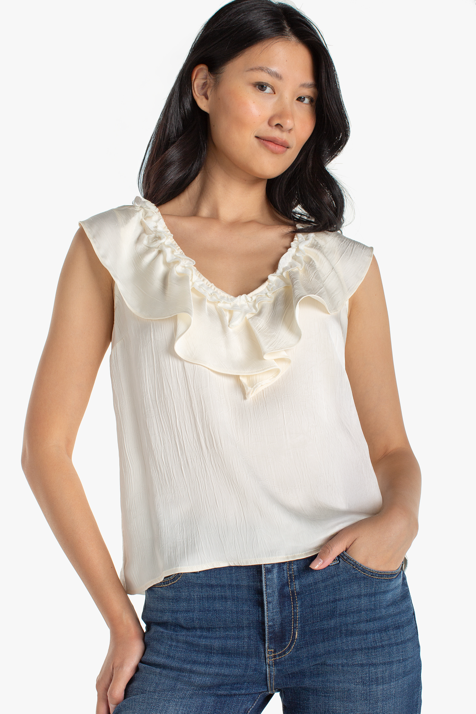 Effortlessly polished with a soft feminine edge, the Aimee Ruffle Top brings elevated texture to your everyday wardrobe. Designed with a delicate ruffle neckline and flattering sleeveless V-neck silhouette, this versatile piece features a crinkled satin woven front for a refined look, balanced by a breathable jersey knit back that keeps you comfortable all day. The warm French Vanilla hue makes it an easy neutral you’ll reach for season after season—perfect for dressing up or keeping things casually chic.