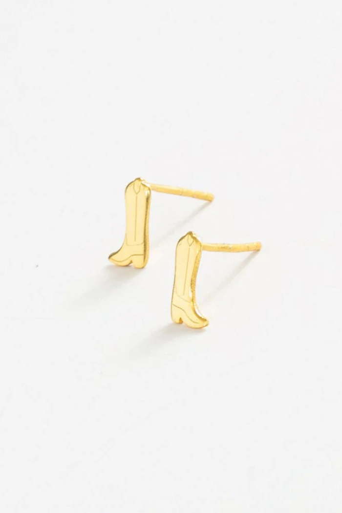 Kick up your style with the Alice Cowboy Boot Post Earrings in Brass, a western-inspired and chic accessory. Crafted from gold-plated brass, these small stud earrings feature a cowboy boot design that adds a touch of rustic charm to your look. Alice is the ideal choice for those who want to express their love for western fashion in a stylish and sophisticated way.
