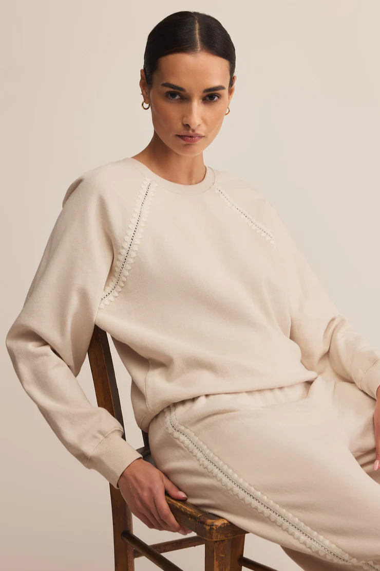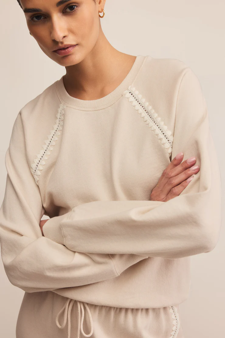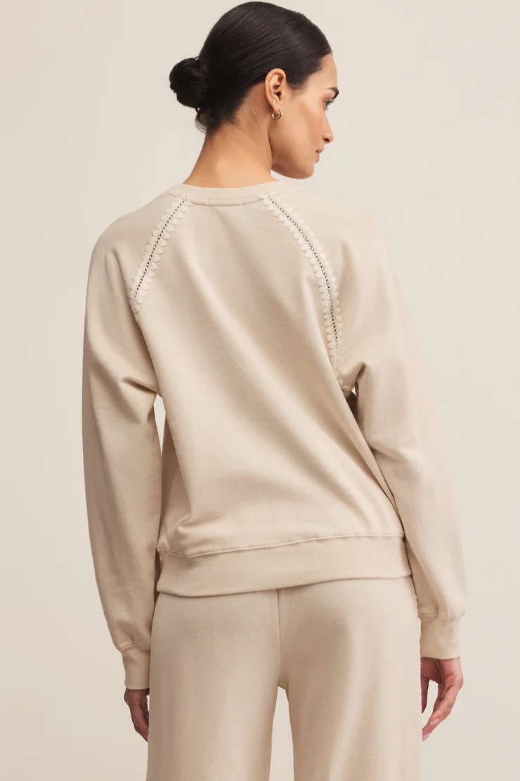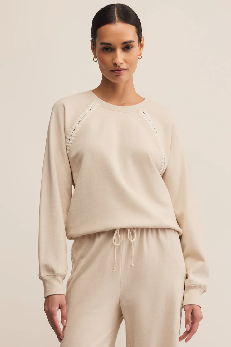 Detailed embroidery and crochet-accented raglan sleeves elevate this relaxed crewneck sweatshirt, crafted from cozy 100% cotton French terry. It's the stylish upgrade you've been looking for.
