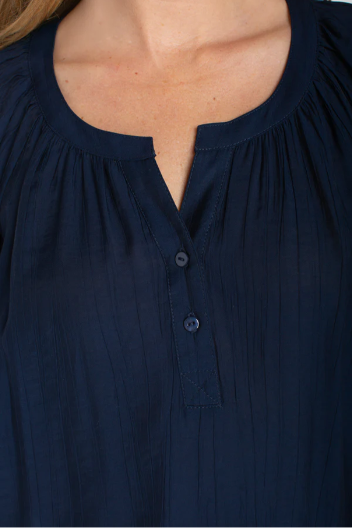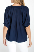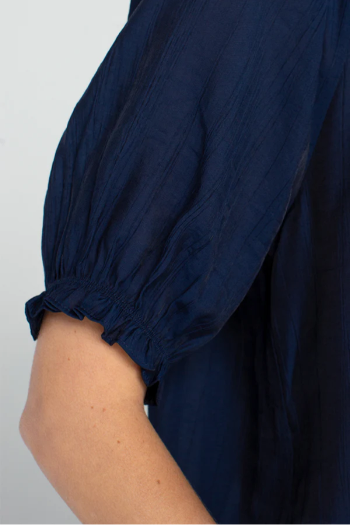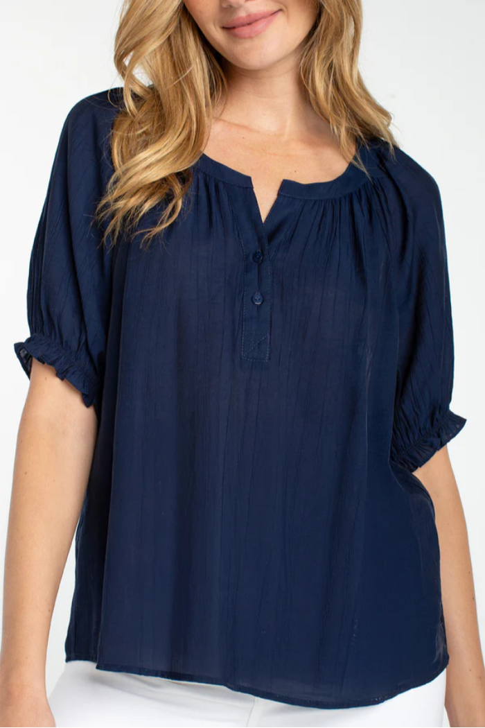 Chic, feminine, and effortlessly versatile—the Ashley Woven Blouse is your go-to piece for warm-weather polish. Designed in a timeless navy hue, this lightweight top features soft puff sleeves, delicate shirring details, and a flattering split scoop neckline that adds subtle dimension and elegance. Easy to dress up or down, it’s a refined staple that transitions seamlessly from daytime outings to elevated evenings.