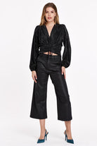 Super high rise cropped wide leg pants. It's the vivacious fit that sits at natural waist and relax fitting in the hips and thigh. Cropped inseam on black stretch woven with surface coating for that extra sheen of natural elevating elegance, side slant pockets, tailor pressed seam finish.