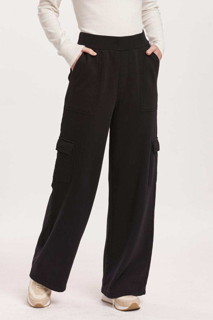 High rise cargo pants with wide leg opening, lounge wear & drawstrings loosely for a comfort & utility with front pouch, back welt & side cargo pockets. Ever-ready for all you do, the adventure awaits! Solid color knit on relaxed fit.