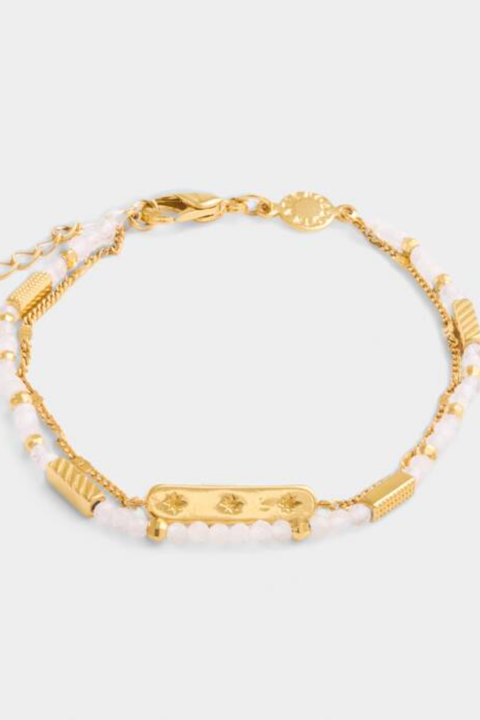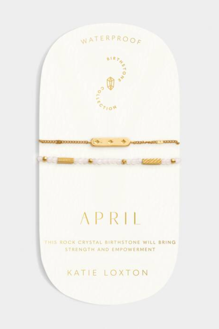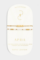 Certified waterproof our 'April' Birthstone Bracelet is designed in durable 18K Gold PVD Coating making it waterproof beach-proof and life-proof. It features the month's real semi-precious stone Rock Crystal and is beautifully presented on a card that highlights the birthday girl's unique traits. For the ideal gift pair this bracelet with the matching Birthstone Keychain and Pouch.