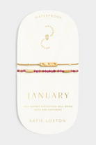 Certified waterproof our 'January' Birthstone Bracelet is designed in durable 18K Gold PVD Coating making it waterproof beach-proof and life-proof. It features the month's real semi-precious stone Garnet and is beautifully presented on a card that highlights the birthday girl's unique traits. For the ideal gift pair this bracelet with the matching Birthstone Keychain and Pouch.