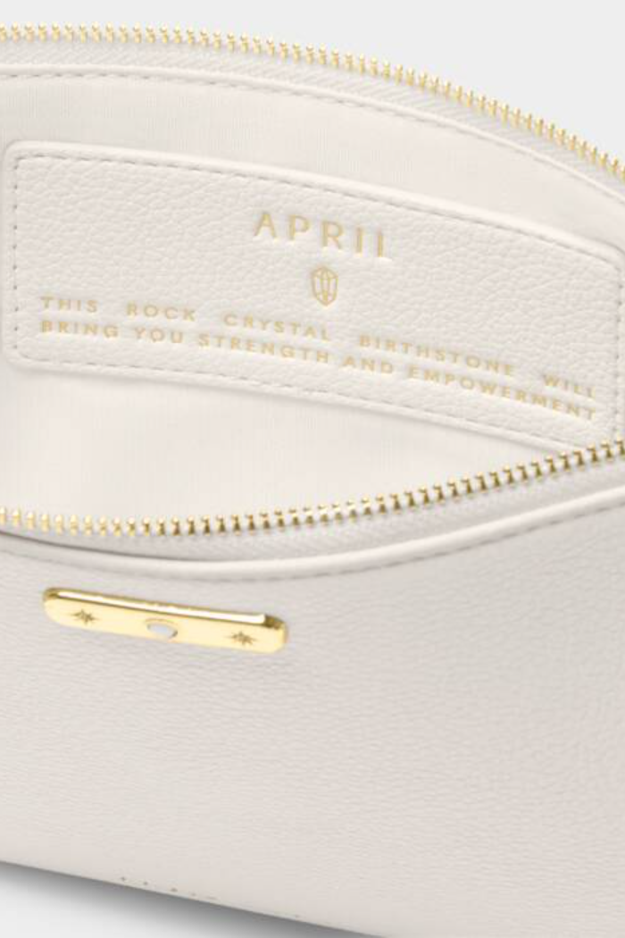 Our 'April' Birthstone Pouch features custom gold-tone hardware beautifully set with the month's real semi-precious stone Rock Crystal. Inside the zip closure you'll discover a hidden message and individual traits that perfectly represent the birthday girl. For the ideal gift pair this pouch with the matching Birthstone Bracelet and Keychain.