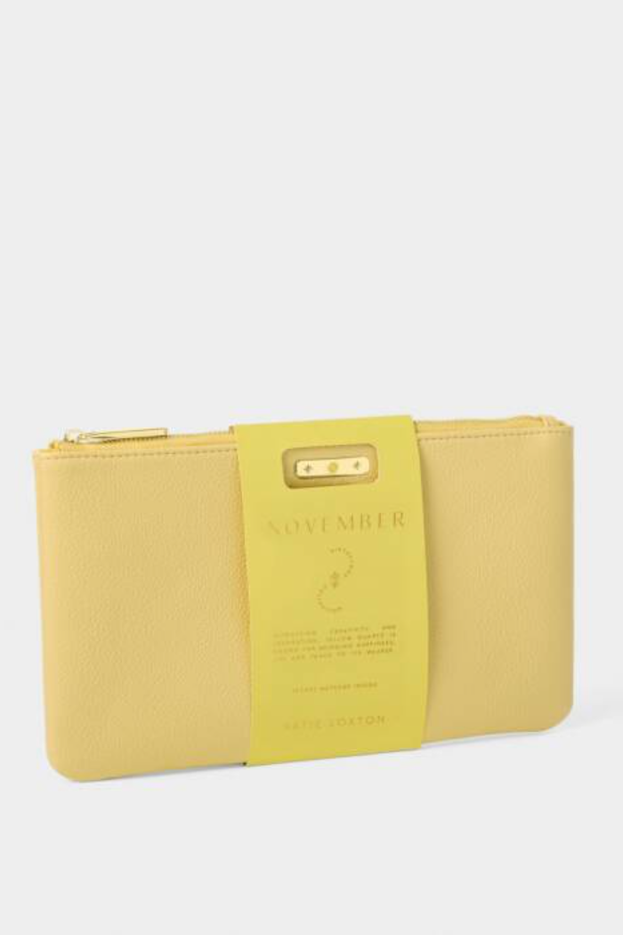 Our 'November' Birthstone Pouch features custom gold-tone hardware beautifully set with the month's real semi-precious stone Yellow Quartz. Inside the zip closure you'll discover a hidden message and individual traits that perfectly represent the birthday girl. For the ideal gift pair this pouch with the matching Birthstone Bracelet and Keychain.