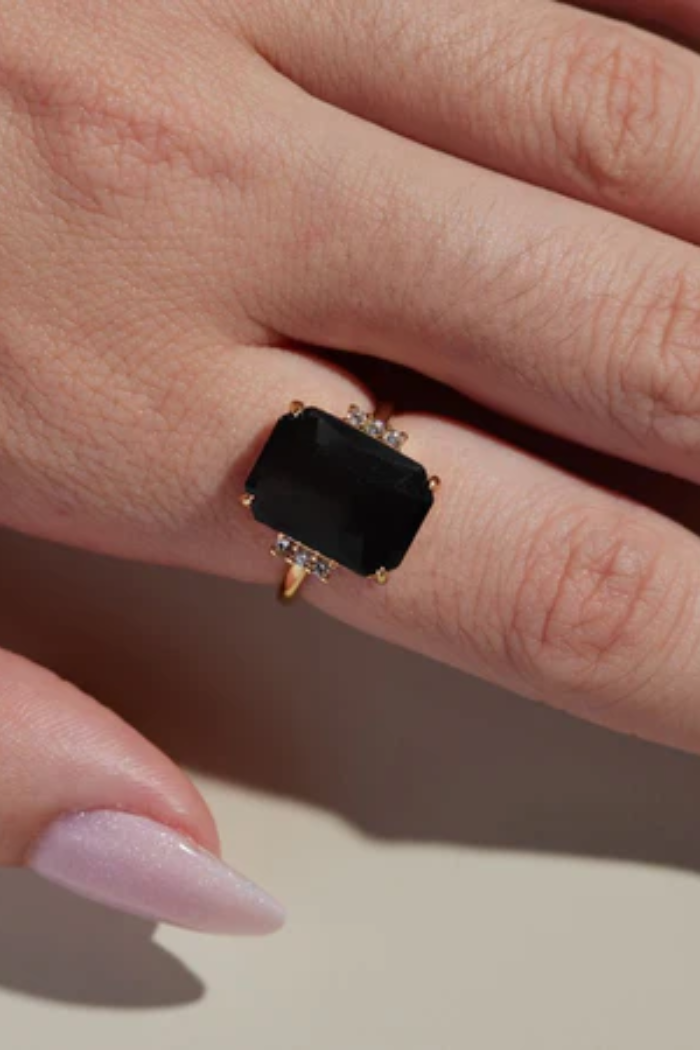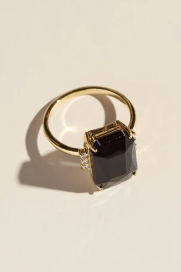 This stunning gold ring features a black cut genuine glass stone at its center. This luxe design is elegantly crafted from 14k gold plating over plated brass.