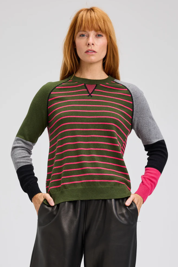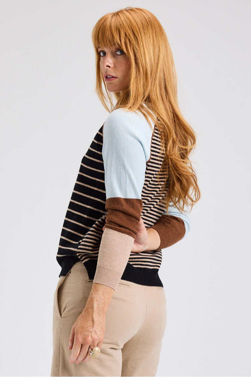 Fall in love with the refined yet playful charm of the Breton Sweater by Zaket & Plover. This cozy knit showcases a sophisticated mix of patterns, featuring fine stripes along the front for a classic touch and bold color-blocked sleeves that add modern contrast. Perfect for effortlessly elevating your everyday look with a hint of artistic flair.