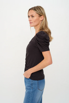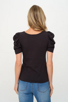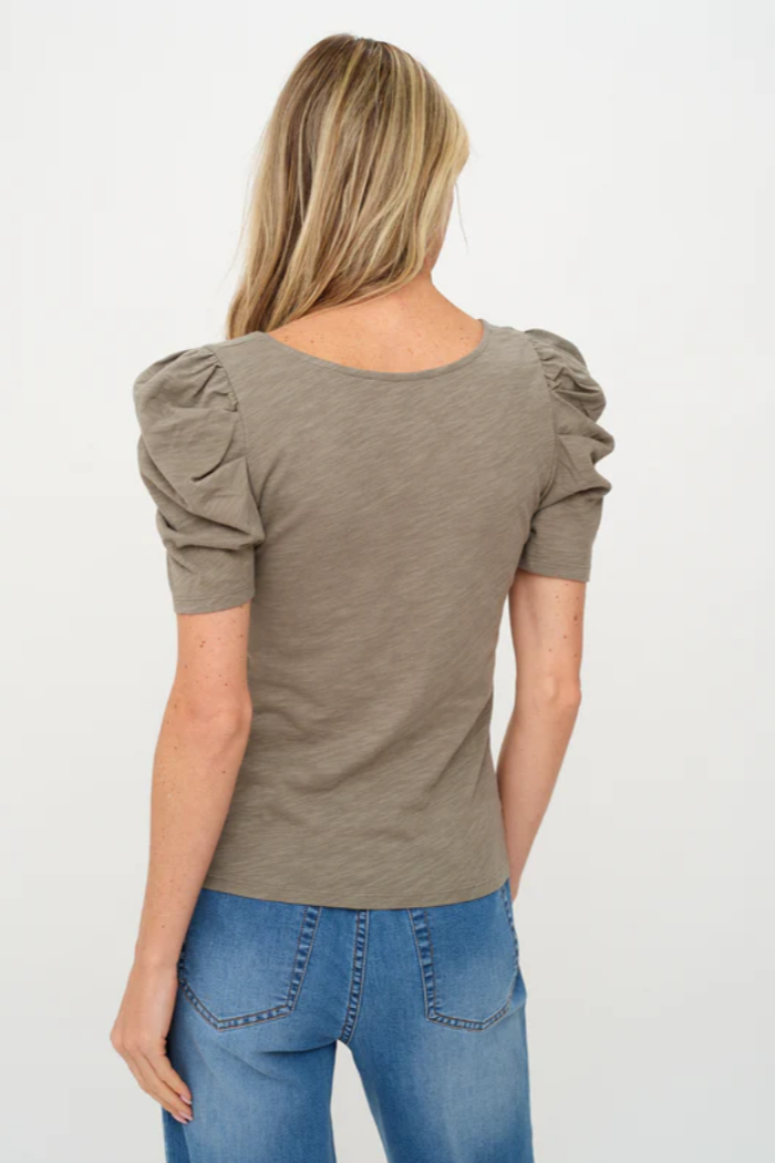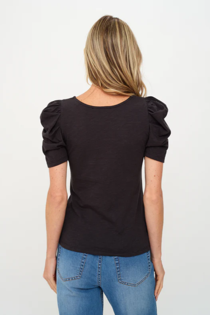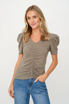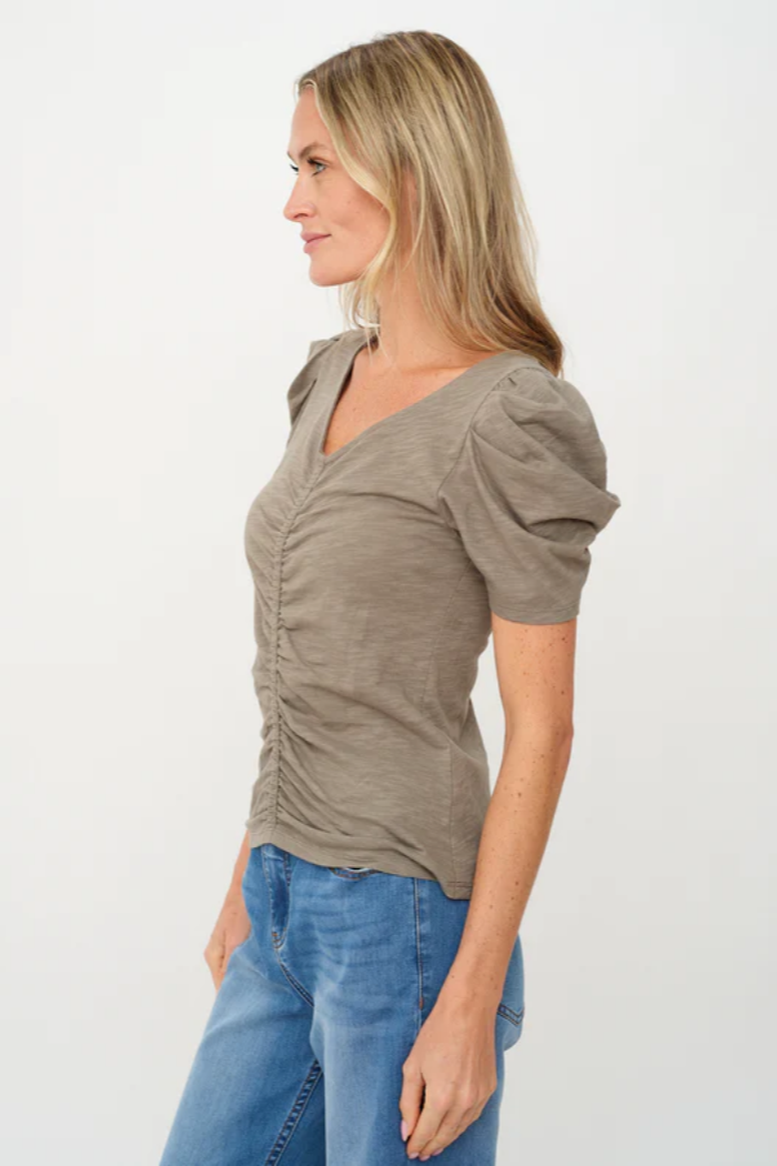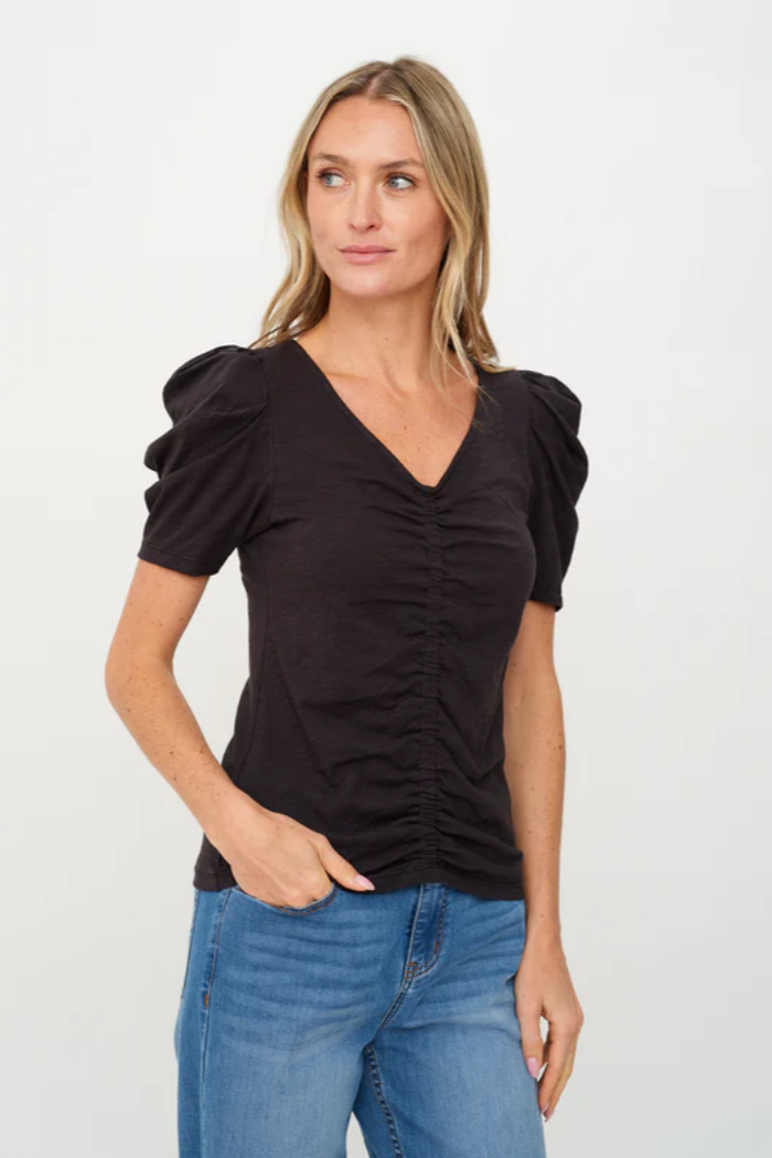 Introducing the Camilla Tee! Featuring charming puffed sleeves and ruching down the center, this lightweight v neck tee is perfect for everyday wear. Stay cool and stylish with its short sleeves. Who says basics have to be boring? Not us!