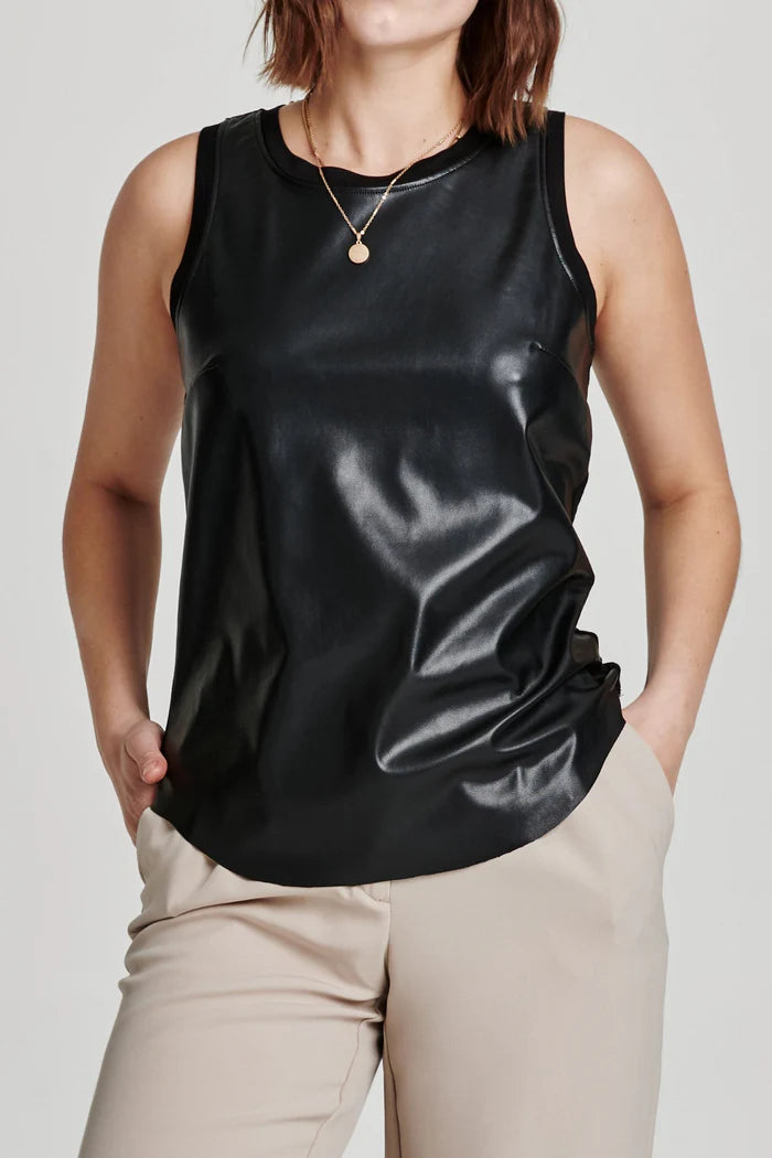CARMELA mix media tank, v-neck finish sleeveless with armhole band & neck in vegan leather. On trend leisure for any occassion... Let's rock! Solid color pleather on standard fit.