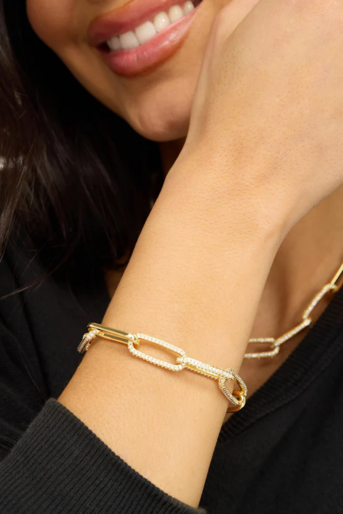 Our best selling Carrie Chain now has a sequel. With a dose of pavé links this classic style becomes something completely new. The Carrie Pavé Chain Link Bracelet is a great piece to wear by itself or even paired with its matching necklace!