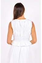 The high neckline gives it a modern, refined edge, while delicate ruching through the bodice creates a figure-enhancing silhouette that hugs in all the right places. A subtle peplum-style hem adds a touch of movement and shape, making it just as pretty worn on its own as it is layered. Crafted from a breathable cotton-nylon blend with a smooth lining, it feels lightweight yet substantial—perfect for sunny days and easy layering.
