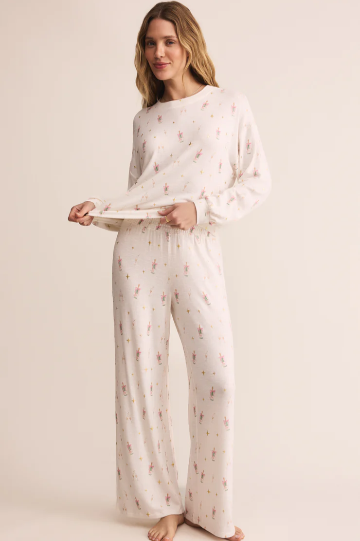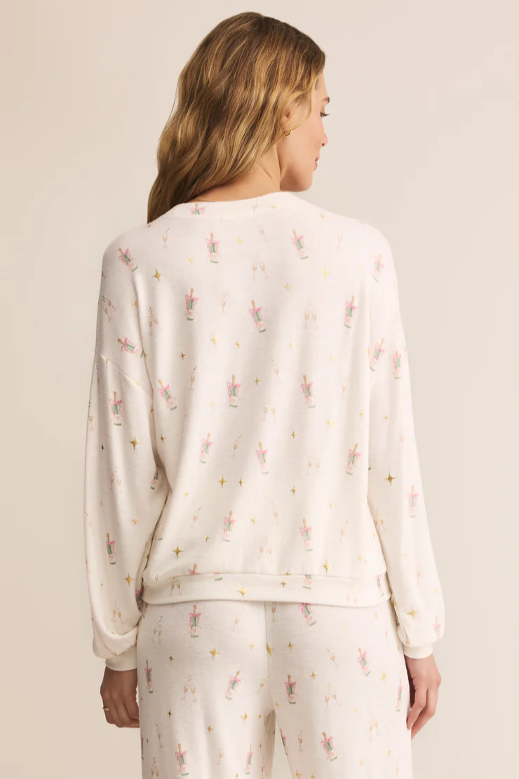 Printed with an allover champagne toast motif, this soft slub knit top blends fun and function. Relaxed and comfy, it’s made for sleep-ins, couch hangs, and slow holiday mornings.