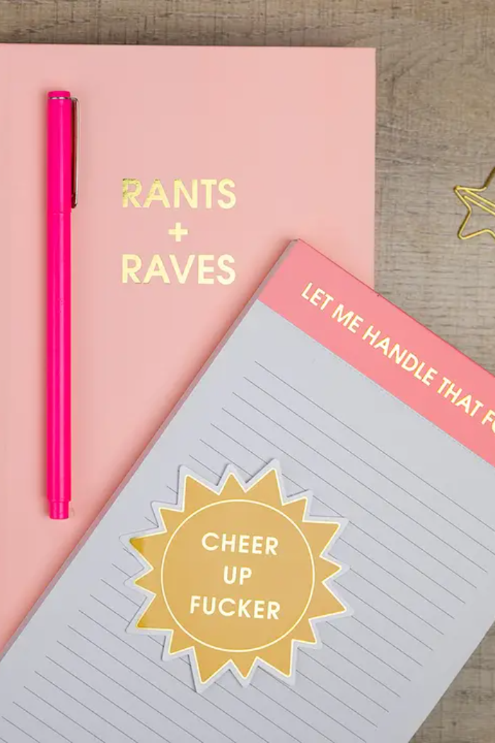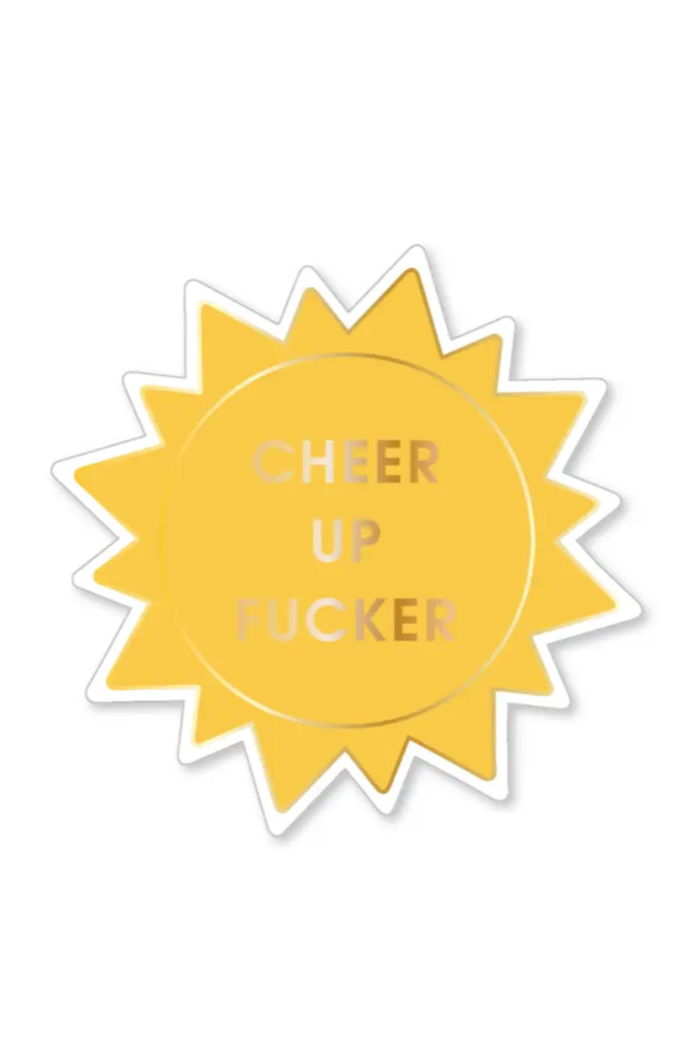 For the days when sunshine feels optional. The Cheer Up Fucker sticker, designed with a bright sun motif, delivers instant attitude and humor wherever it sticks. Glossy, gold-foil accented, and waterproof, it’s the perfect pick-me-up for laptops, water bottles, or notebooks that need a little sass.