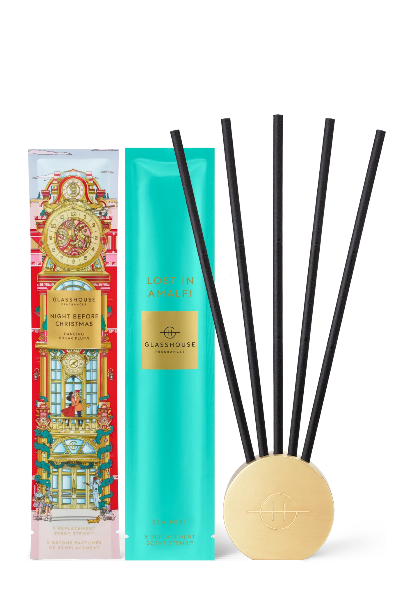 The Scent Scene™ Duo includes two individually packaged Scent Stems™ fragrances: Night Before Christmas Dancing Sugar Plums (limited edition) and Lost In Amalfi To use place your Scent Stems™ of choice into the metal vessel, ensuring it's placed on a flat surface away from open windows or vents. After 30 days, or a time of your choosing, swap out the Scent Stems™ for the other supplied fragrance.