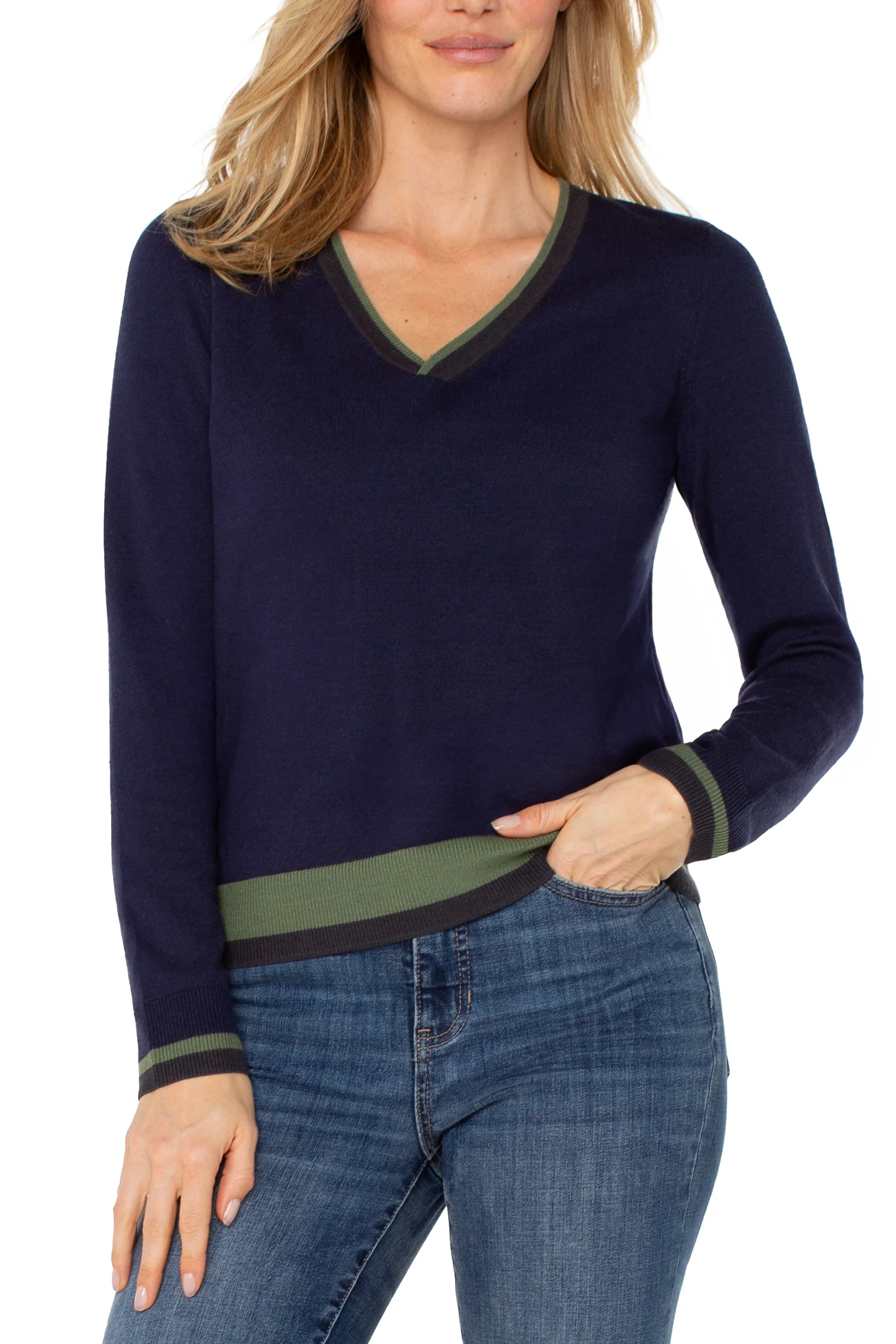 A stylish long-sleeve sweater that effortlessly combines modern design with classic comfort. This sweater features eye-catching color-blocking details on the sleeves, neckline, back, and bottom hem of the body, adding a contemporary twist to a timeless silhouette.