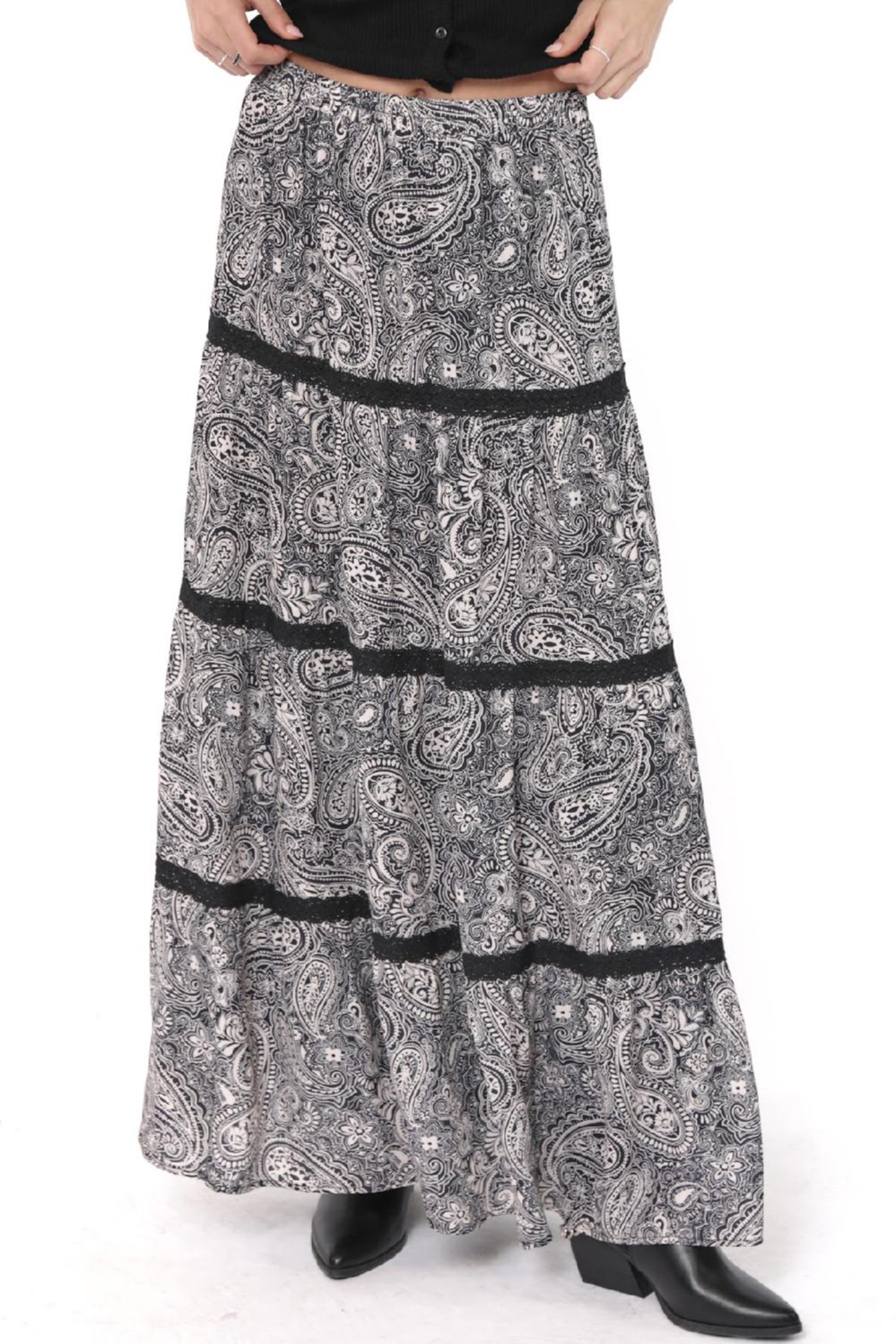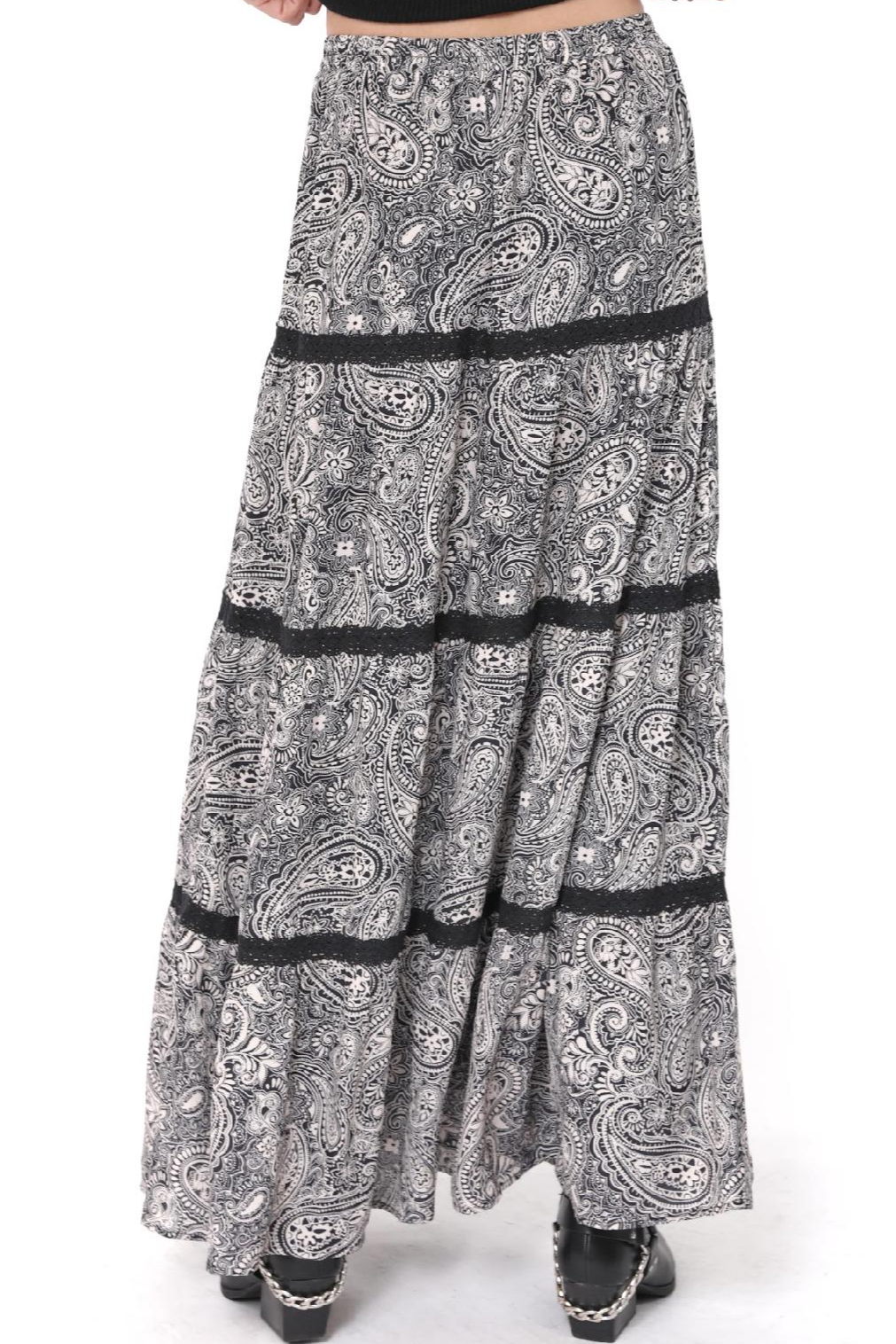 Embrace laid-back elegance with the Cool Girl Tiered Paisley Maxi Skirt in Black Cream from Sadie. This flowing maxi features a classic paisley print in soft black and cream tones, designed in a tiered silhouette that moves beautifully with every step. Delicate lace-inspired trim adds subtle texture and boho charm, while the elastic waistband ensures a comfortable, flattering fit. Finished with an ankle-grazing length that elongates the figure, this skirt transitions effortlessly through the seasons—style it with boots and a chunky knit for cooler days or keep it simple with a fitted tank when the weather warms up.