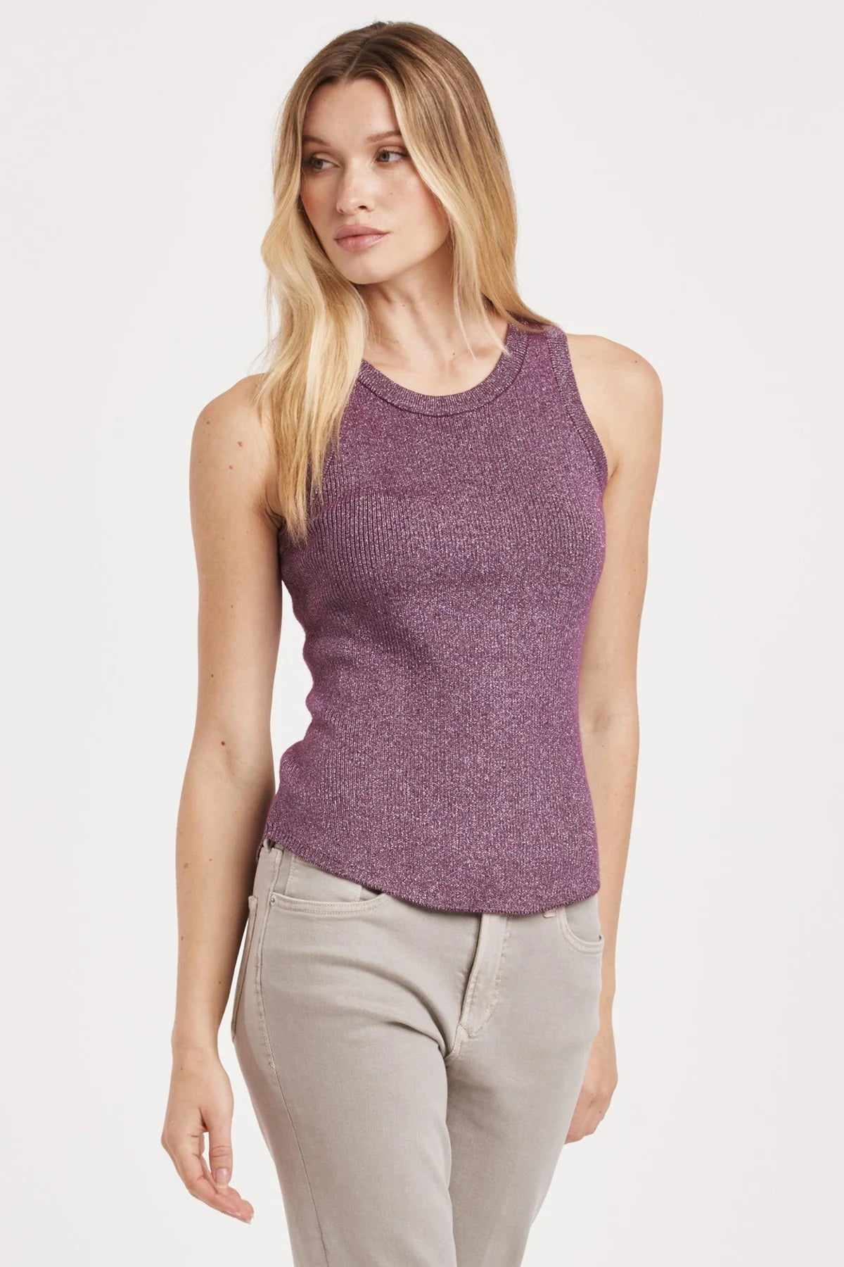 This high-neck sleeveless ribbed tank is expertly crafted from luxurious lurex yarn, offering a sleek, fitted silhouette that combines both comfort and sophistication. The ribbed texture not only enhances the shape but also adds a refined, subtle detail, making it a versatile and stylish addition to your wardrobe. Ideal for layering or wearing solo, this piece seamlessly transitions from casual outings to more dressed-up occasions, blending elegance with utility for any lifestyle.