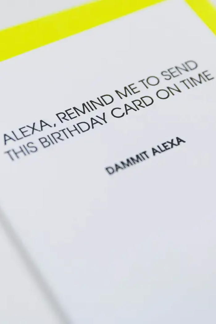 Better late than never—blame it on Alexa. Our “Dammit Alexa” card is letterpress printed by hand on luxe tree free paper, perfect for sending belated birthday wishes with a laugh.