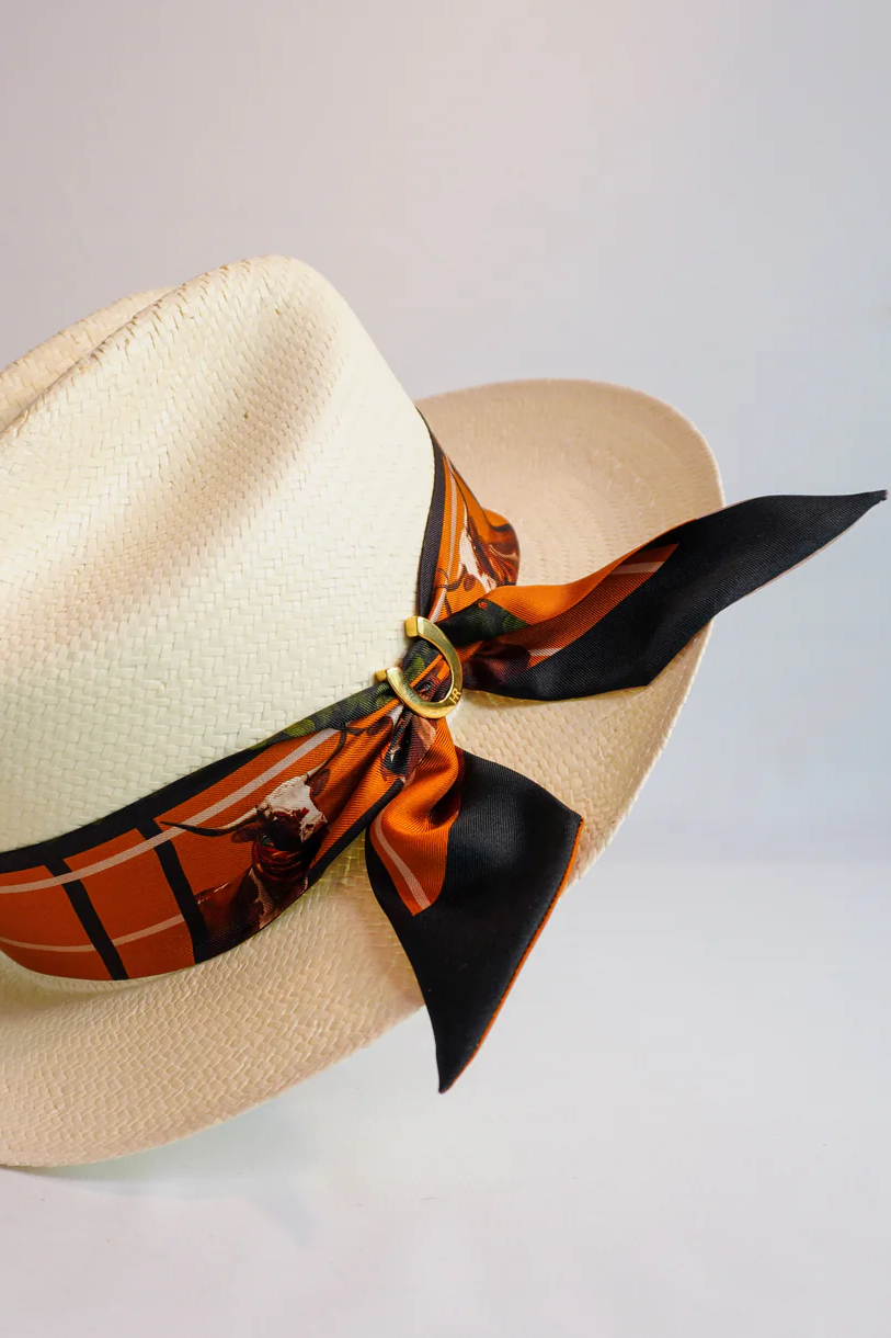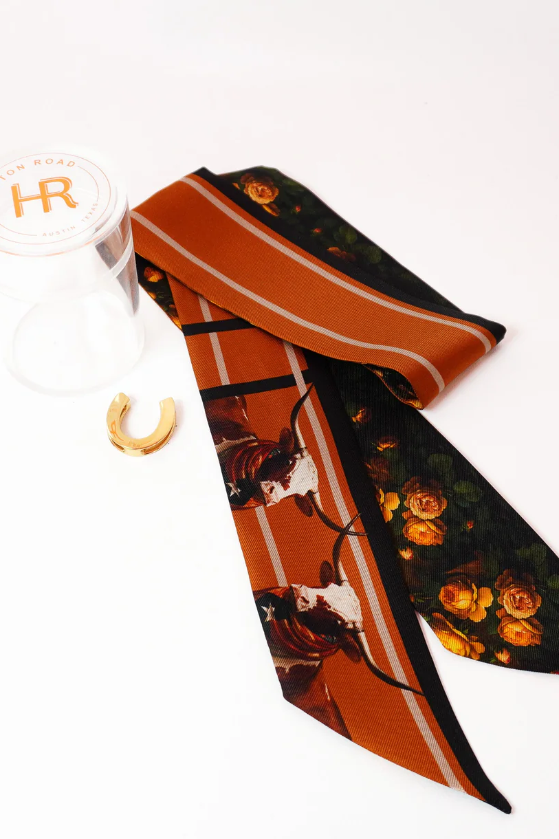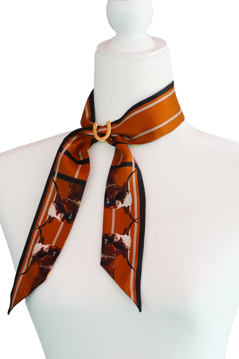 An elegant blend of tradition and modernity, the Hampton Road Silk Twillionaire Scarf Set includes a pure silk scarf and a gold-tone horseshoe-shaped scarf ring, thoughtfully packaged in a sleek acrylic tube for gifting or display. Inspired by classic equestrian motifs and timeless Americana, the scarf features a signature Hampton Road print on luxurious silk twill. Its slim, elongated silhouette is perfect for styling around the neck, wrist, hair, or handbag.