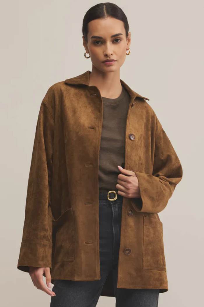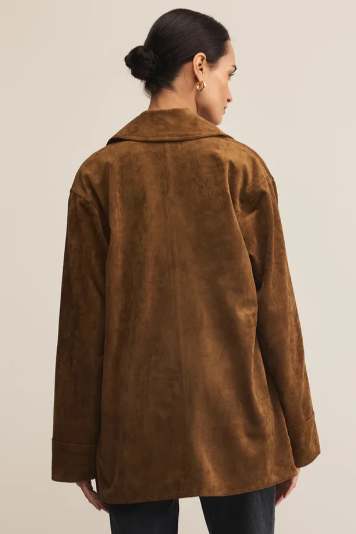 Equal parts rugged and refined. This statement coat brings a cool, clean finish in soft faux suede with patch pockets and an easy, relaxed shape.
