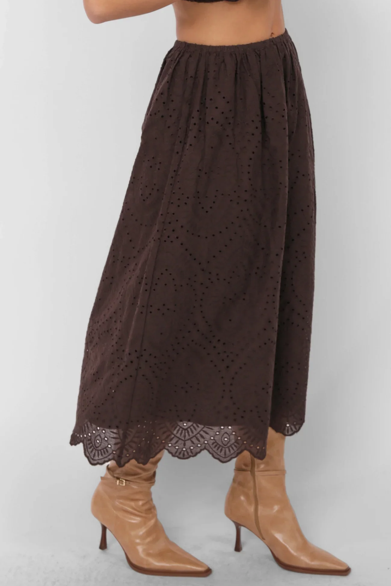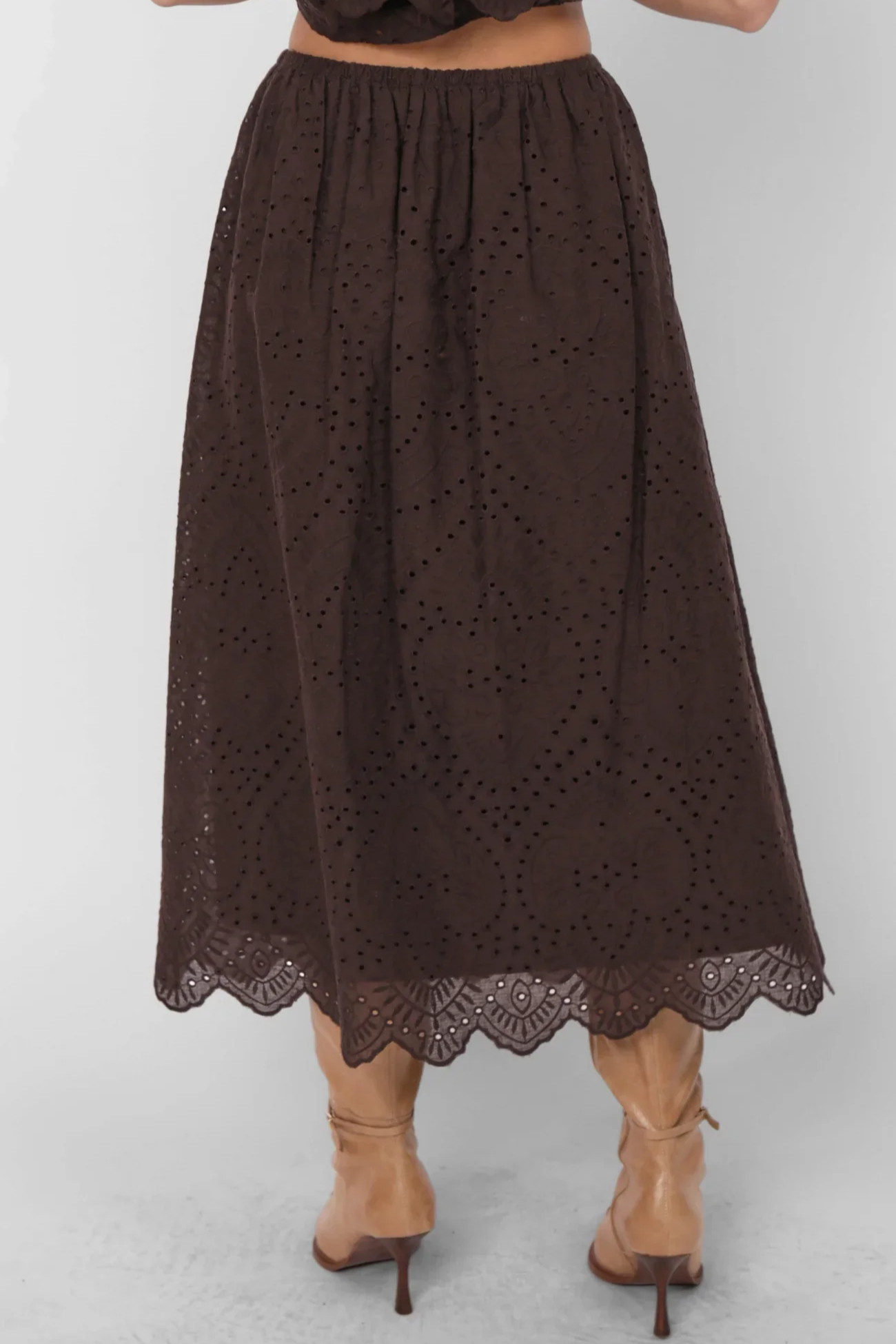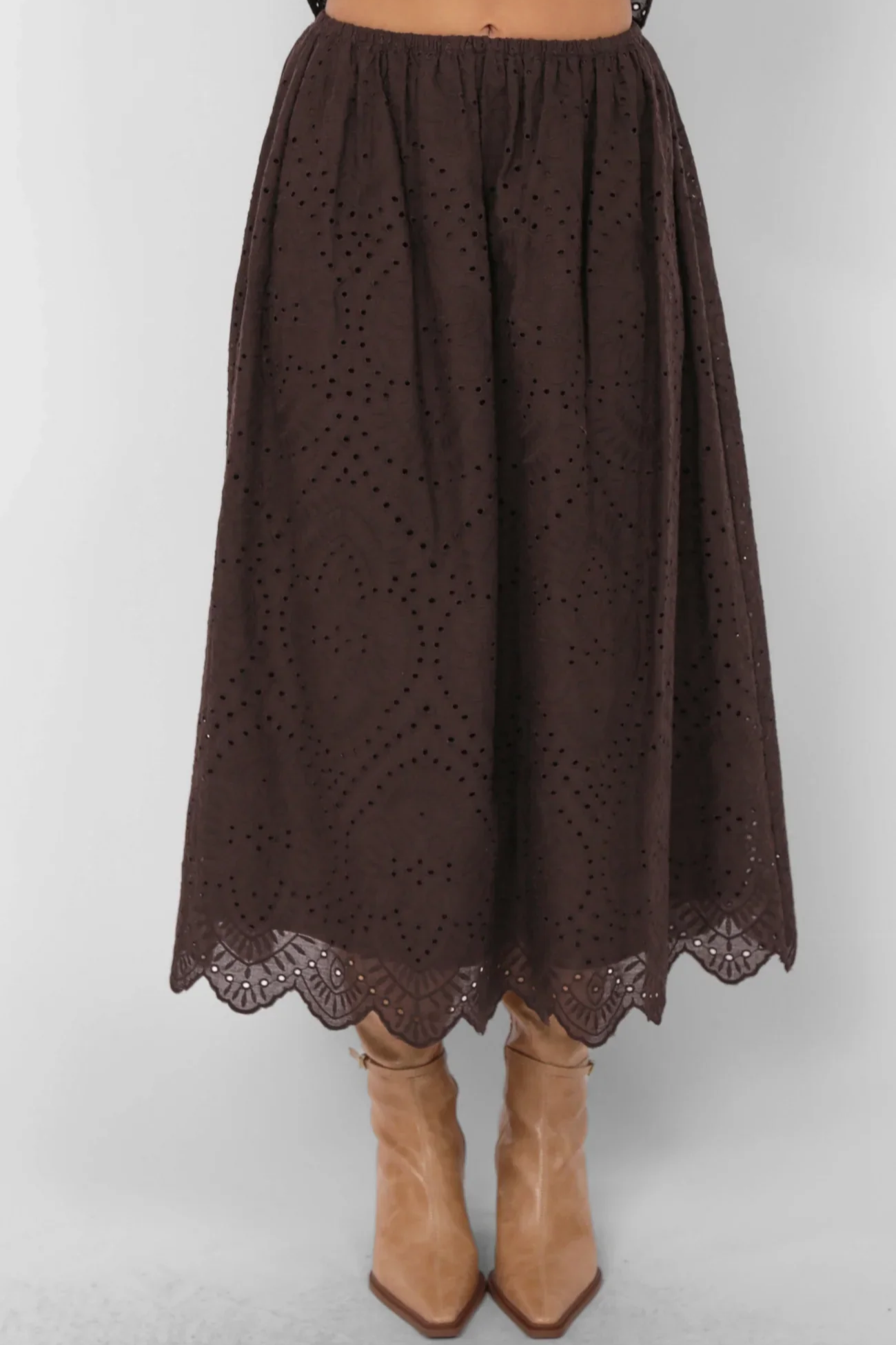 Romantic texture meets effortless wear in the Double Vision Eyelet Midi Skirt in Dark Brown by Sadie and Sage. Designed with an easy elastic waistband, this midi skirt flows beautifully with every step while offering all-day comfort. The intricate eyelet fabric adds depth and softness, finished with a scalloped hem that brings a touch of vintage charm. The rich dark brown hue grounds the look, making it perfect for styling year-round. Pair it with a matching top for a cohesive set moment or style it with a cozy knit and boots for an elevated everyday outfit.