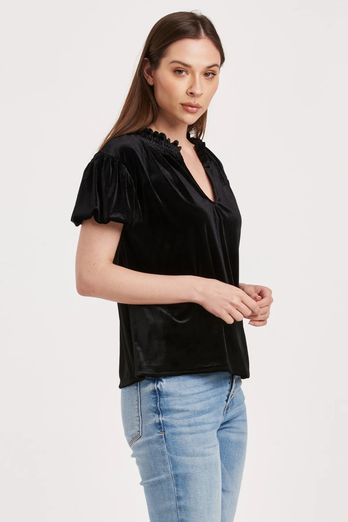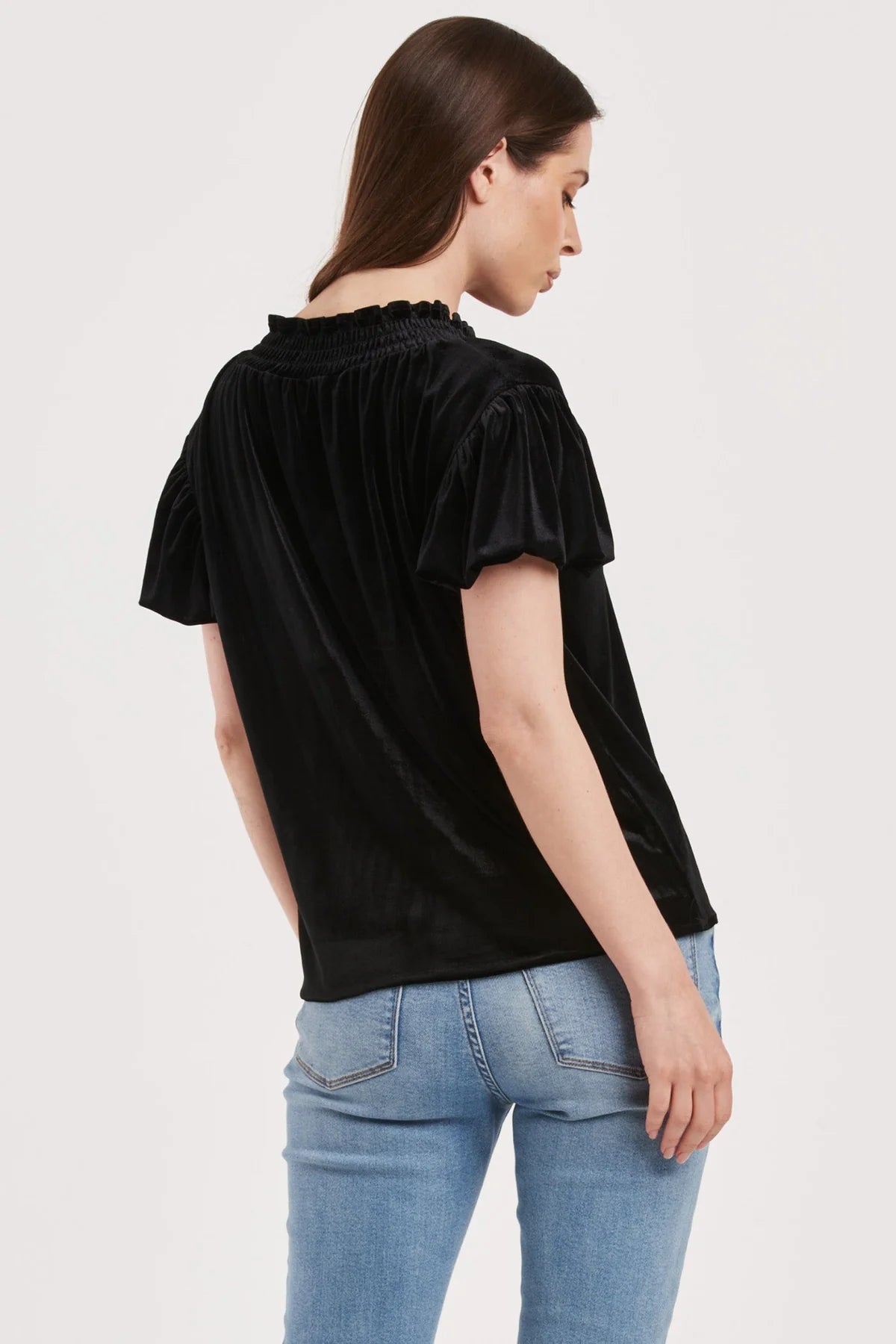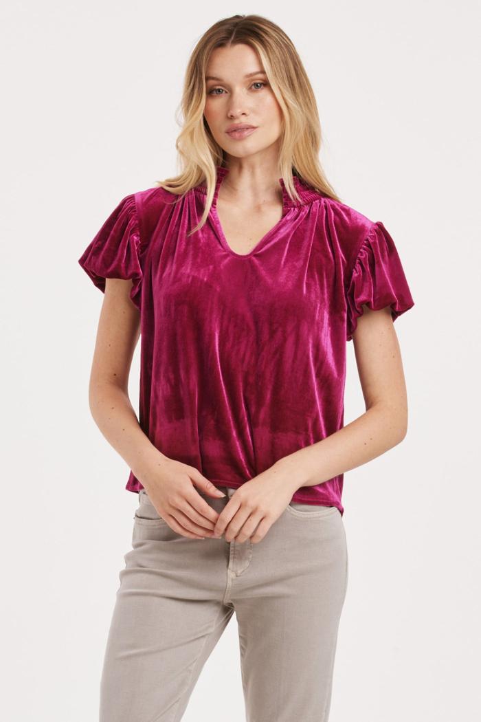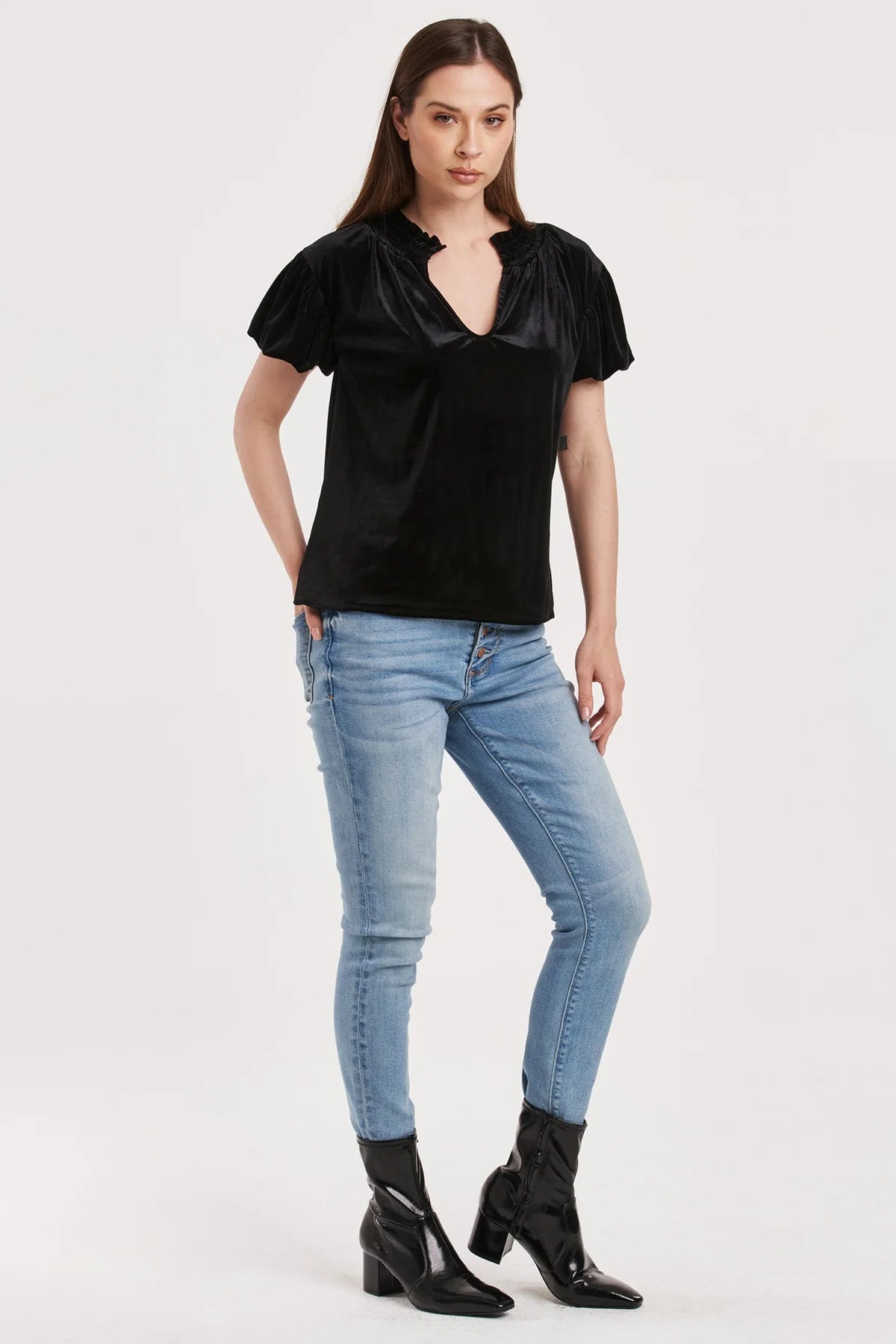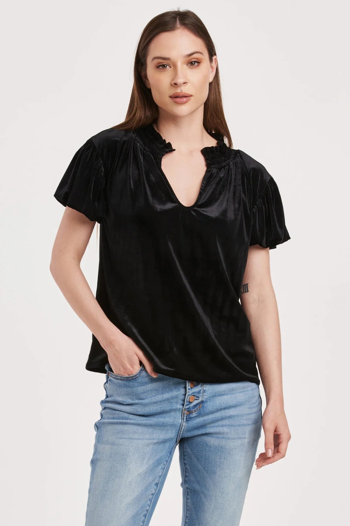 Elevate your wardrobe with this chic short puff sleeve smocking neck top crafted from luxurious velvet. Designed with a smocked neckline, this versatile piece adds a touch of elegance to any outfit. Its relaxed fit ensures comfort for all body types, making it perfect for transitioning seamlessly from day to night. Dress it up for an evening out or keep it casual for brunch; this top is an essential addition to your closet.