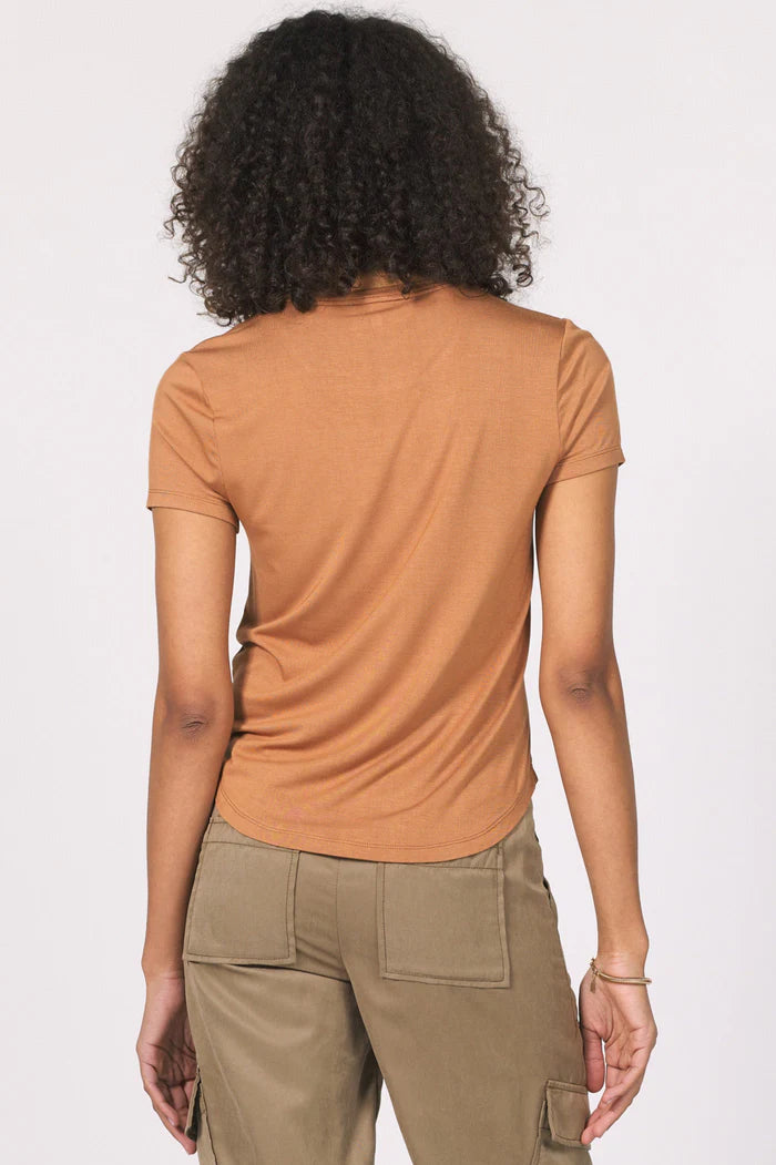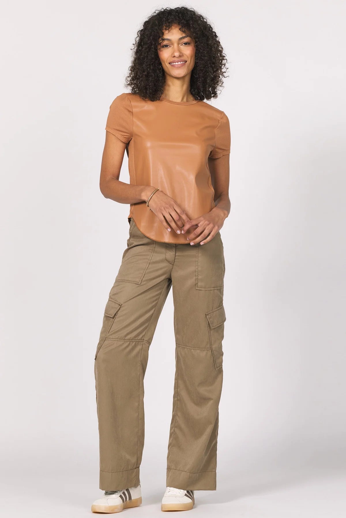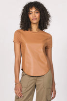 Elaina short sleeve front vegan leather top stands out in every crowd. Designed for appreciation of quality and comfort, this sophisticated crew neck piece adds a hint of edge to any outfit. Perfect for any lifestyle, pairs effortlessly with any bottoms for your favorite look.