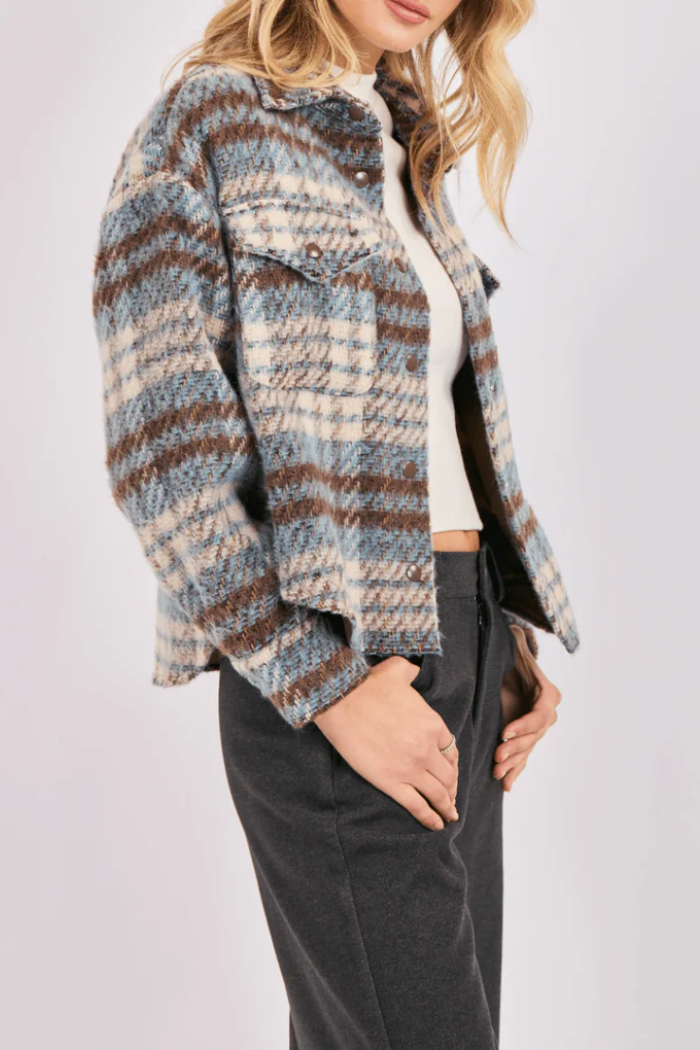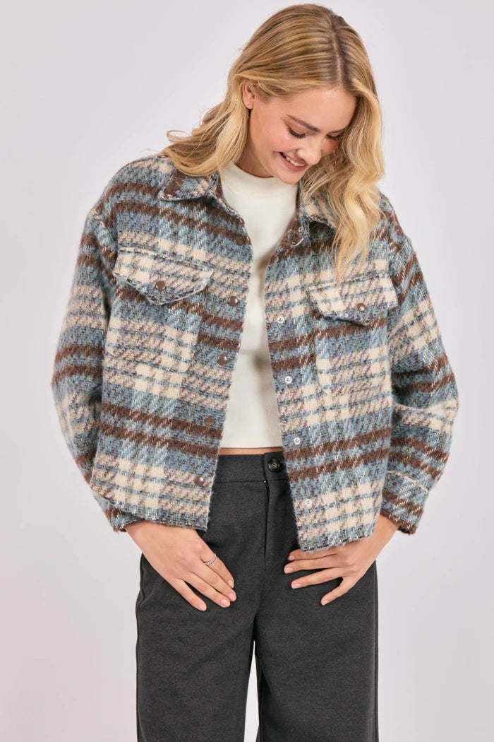 The Eloise Plaid Shacket is the ultimate layering essential, combining the tailored look of a jacket with the easy comfort of a shirt. Crafted from a soft, brushed fabric, its blue-and-brown plaid adds cozy texture and effortless depth to your everyday style. Designed with a relaxed, boxy silhouette, this slightly cropped shacket features a classic collar, snap-front closure, and chest patch pockets, perfect for tossing on over tees or knits during cool mornings and laid-back afternoons.
