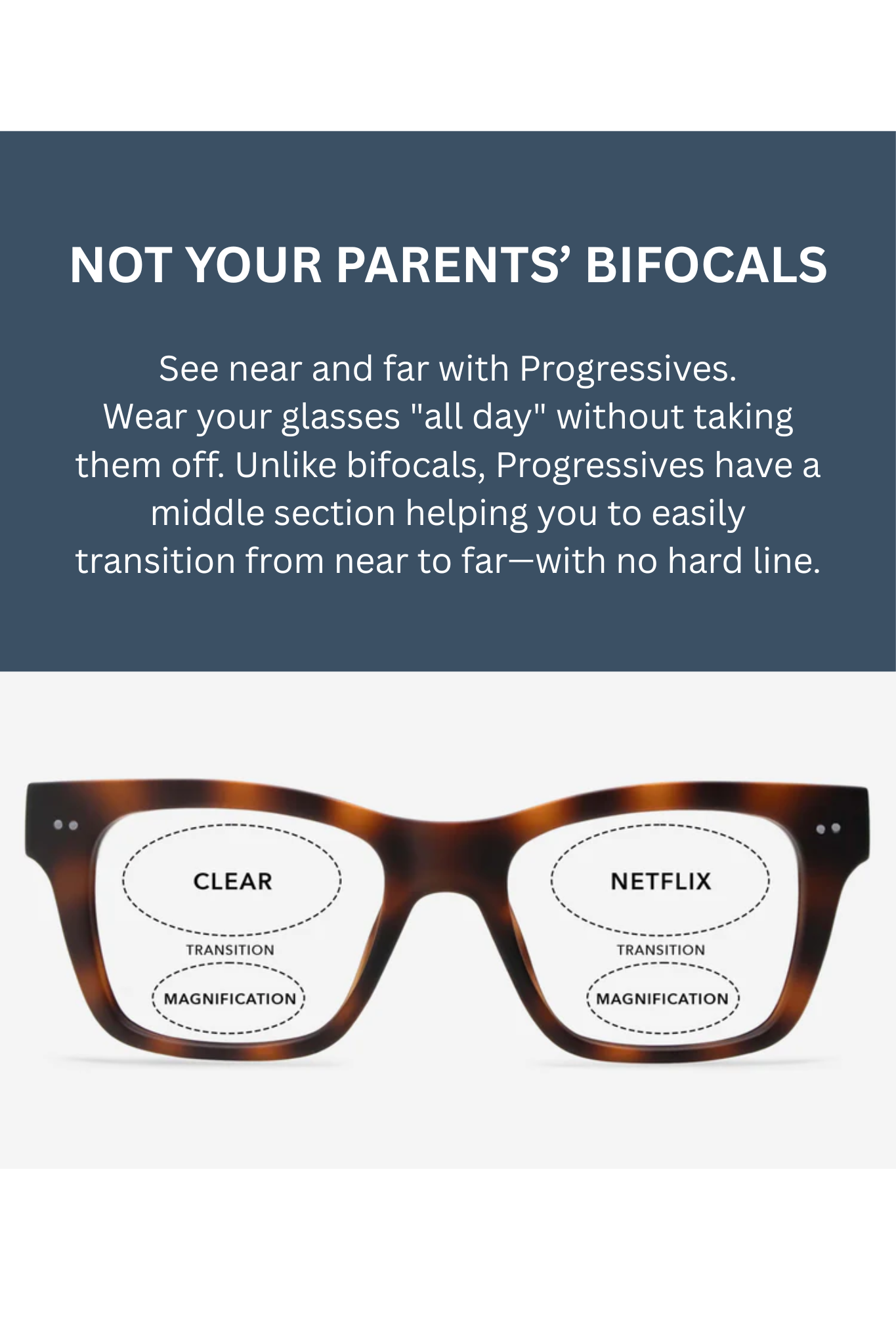 See near and far with Progressives. Wear your glasses "all day" without taking them off. Unlike bifocals, Progressives have a middle section helping you to easily transition from near to far—with no hard line.