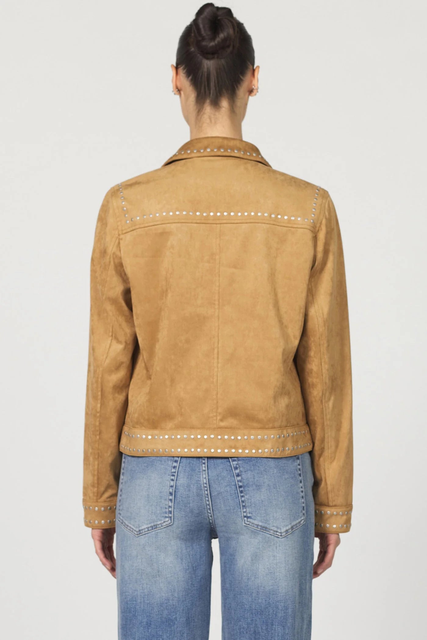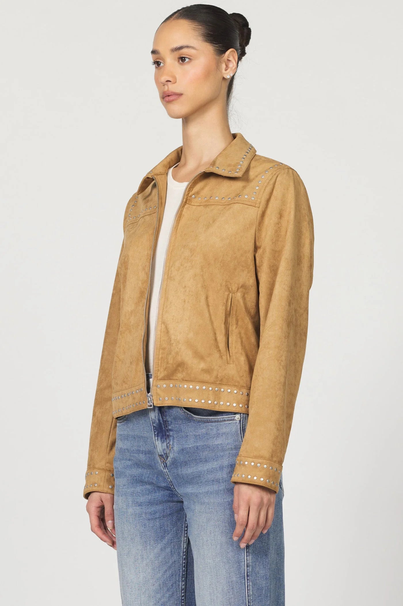 The highlight in Exene zipper front collared jacket with a studded design, offering a relaxed fit for everyday comfort.