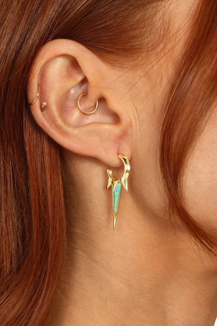 The Gabriella Blue Opal Triple Spike Earrings from Melinda Maria are a fearless nod to statement style, with an irresistible twist. A trio of polished gold spikes paired with luminous blue opal accents creates a captivating balance of edge and elegance. They sway. They shimmer. They demand attention. Whether you’re pairing them with a sharp blazer and sleek hair or letting them glint through tousled waves, these earrings instantly elevate your look, no added effort needed.