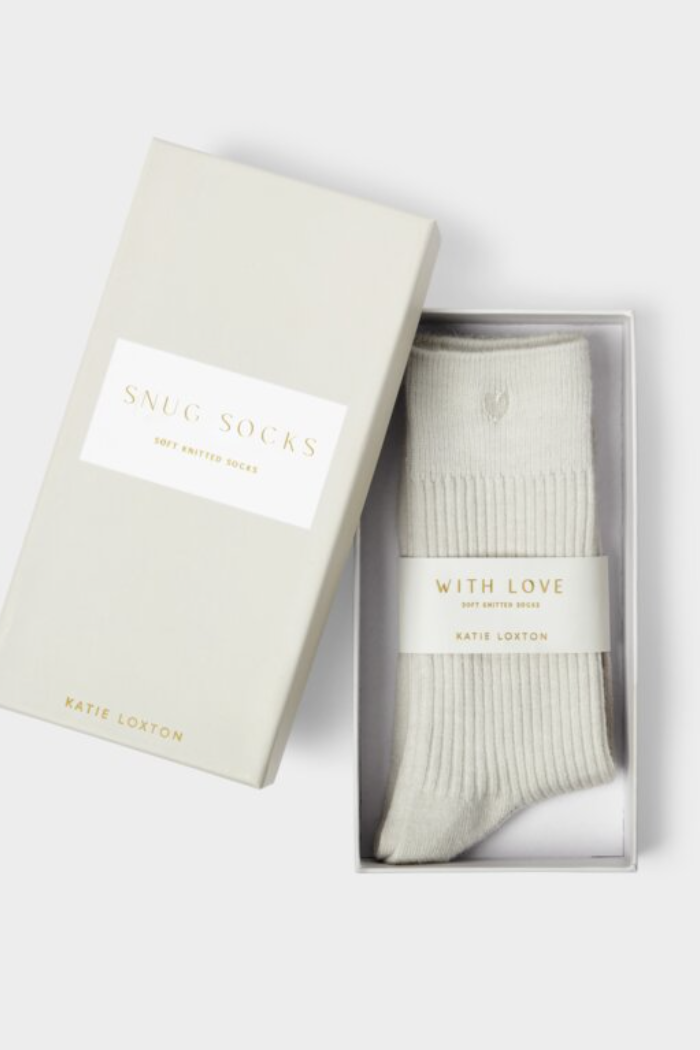 Our Socks Gift Set in Off White features a super-soft ribbed pair of socks with an embroidered heart detail, perfect for keeping feet cosy. All wrapped up in a beautiful gift box with the sentiment 'Snug Socks,' ready to surprise and delight the lucky recipient.