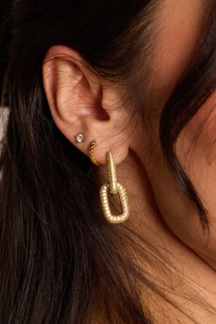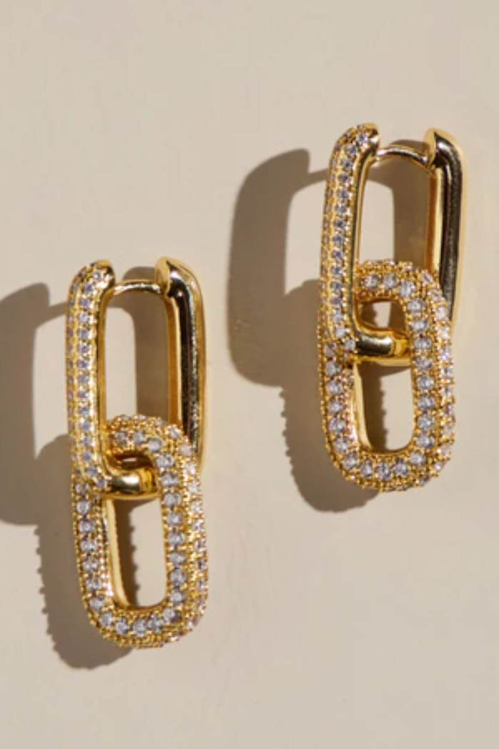 Elevate your style with the Pavé Double Link Hoops, featuring two interlocking hoops embedded with sparkling pavé crystals. These elegant earrings add a touch of timeless glamour to any outfit, perfect for day or night.