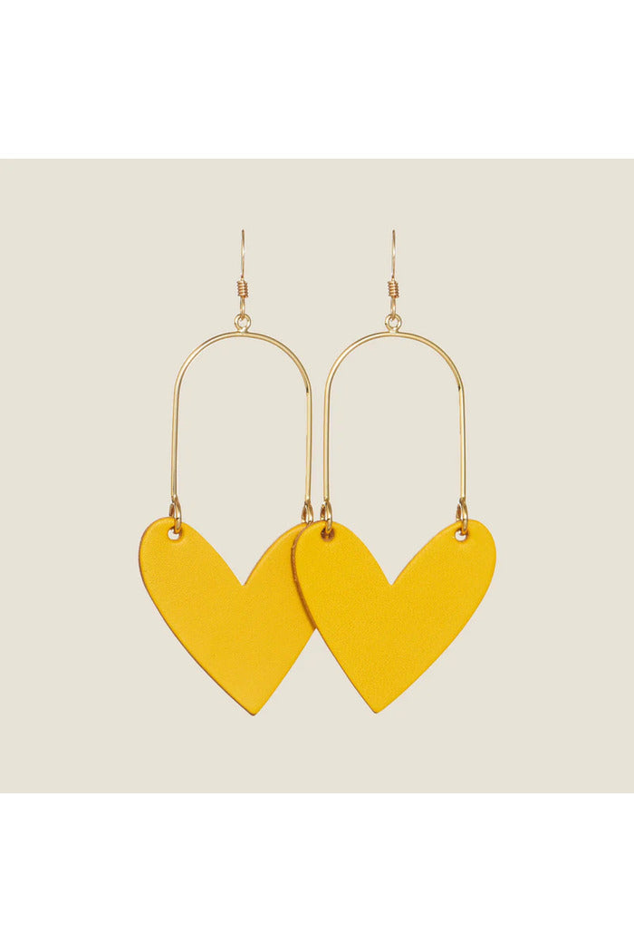 Gold Sweethearts feature our smooth, matte yellow-gold leather in our patented heart statement shape. These lightweight statement earrings are attached to gold or silver hoop hardware for optimum shine and weightlessness.