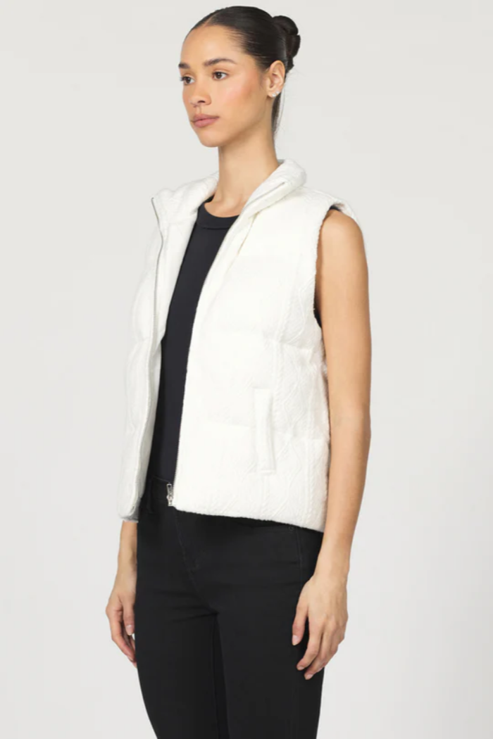 The Hadley Zip Up Vest in Cream by Dear John brings a modern, sporty touch to your everyday wardrobe. Crafted with a soft knit feel and a structured high neckline, it delivers the perfect blend of comfort and polish. The functional front zipper adds versatility, wear it fully zipped for a sleek, cozy look or open over your favorite layers for effortless styling.