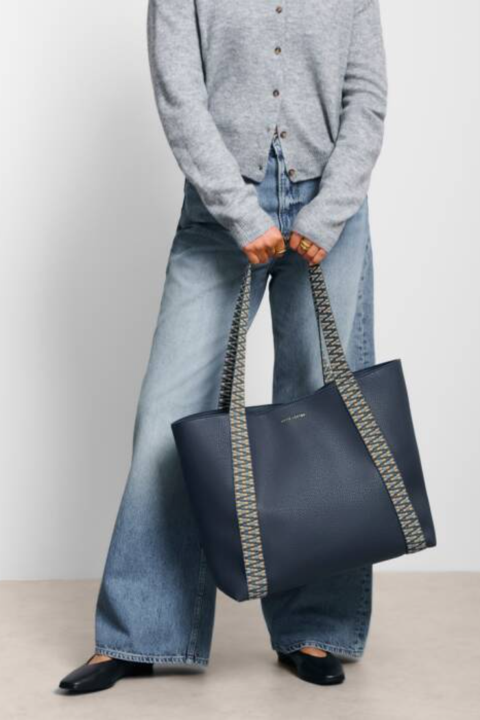 Our Hallie Tote Bag showcases a patterned canvas shoulder strap, easy magnetic popper closure, and a protective suedette lining. Effortlessly stylish and generously spacious, this elevated shopper tote is designed to carry all your daily essentials, taking you from work commute to errand runs with ease.