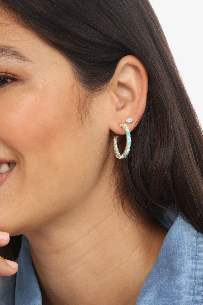 Ombré all day! We’re head over heels for our ombré blue opal stones! At any size the Heiress Hoops are easy and classy to put on and layer for a chic look. But in the **1” size** and featuring a stunning gradient of simulated blue opal colors, the Heiress Hoops are perfect for *any* occasion.