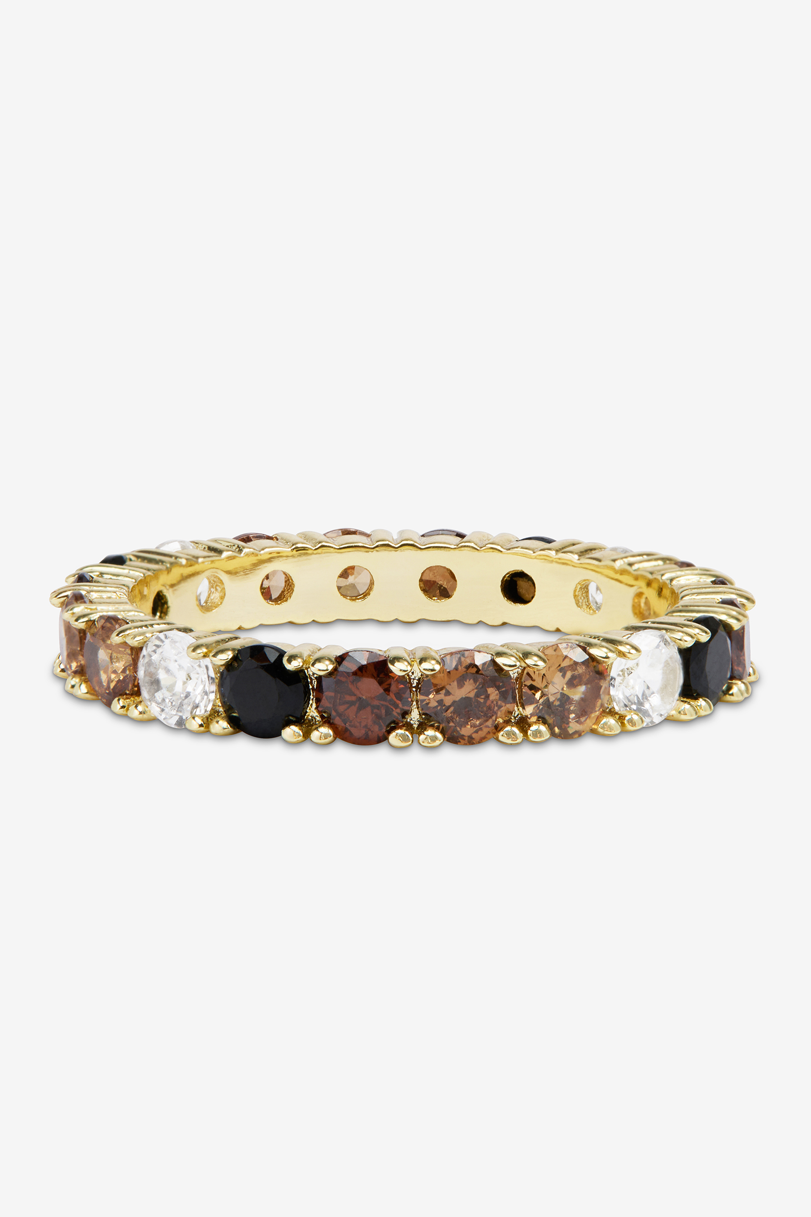 The Heiress Ombre Ring brings timeless elegance with a modern twist. Set in a polished gold band, this eternity-style ring features a gradient of round-cut stones that transition seamlessly from deep onyx-like black to warm cognac and champagne tones, finished with sparkling clear crystals. Each stone is prong-set for brilliance and durability, creating a striking ombré effect that catches the light from every angle.