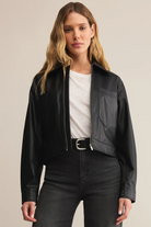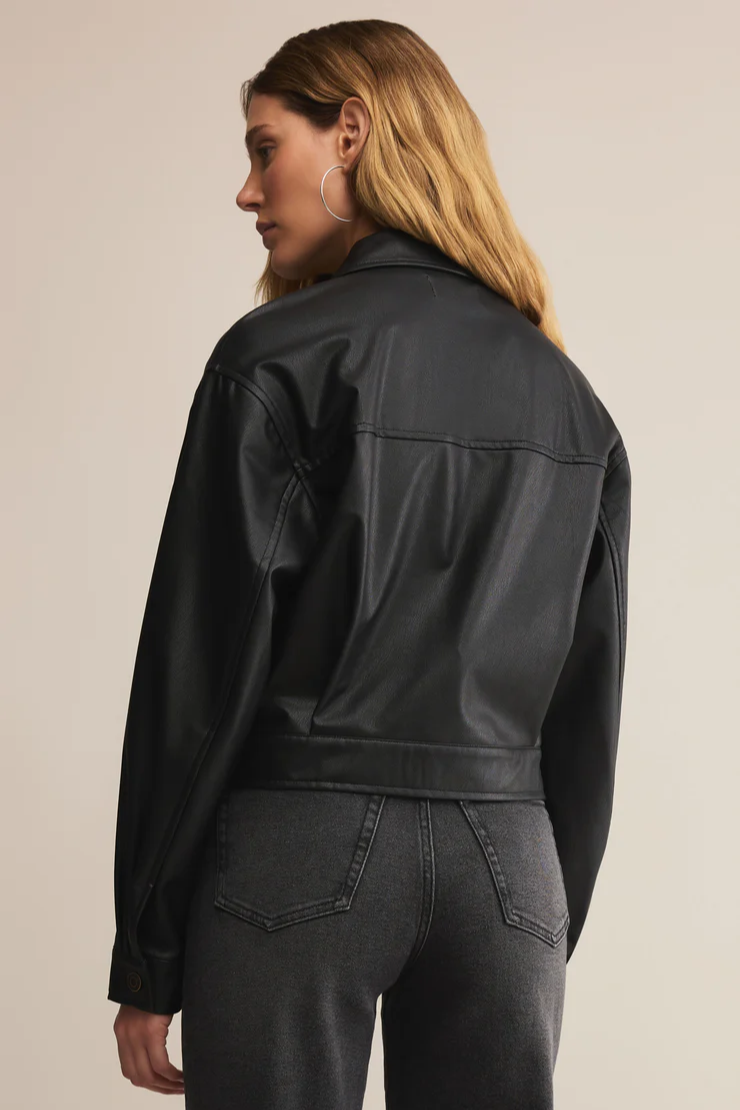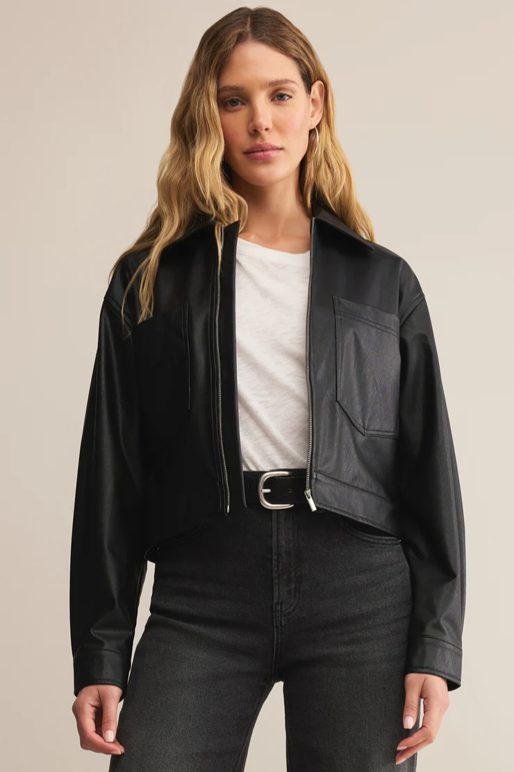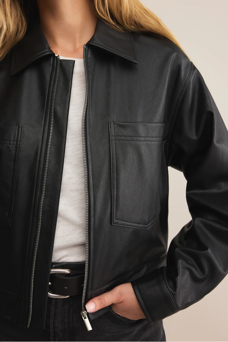 Crafted from soft faux leather with a zip front and patch pockets, this jacket delivers. A seasonal closet staple, it layers effortlessly over denim, dresses, and everything in between.
