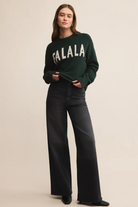 Festive without trying too hard, this crewneck sweater features metallic “Fa La La” intarsia on a cozy midweight knit. It’s playful, soft, and made for everything from casual get-togethers to relaxed days at home.