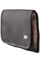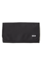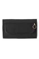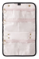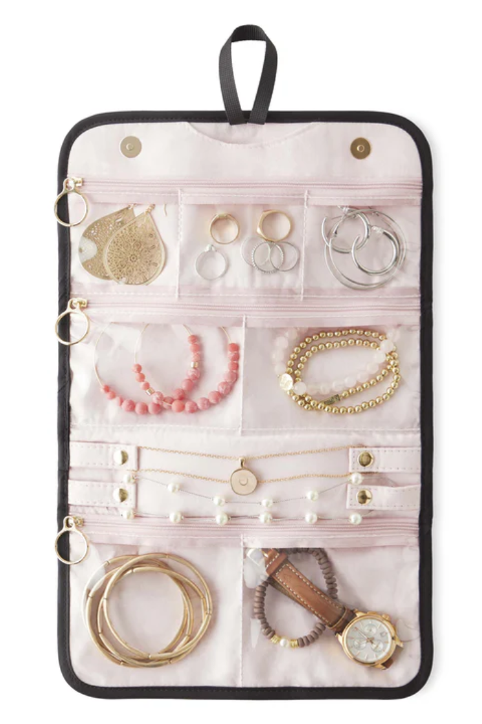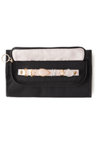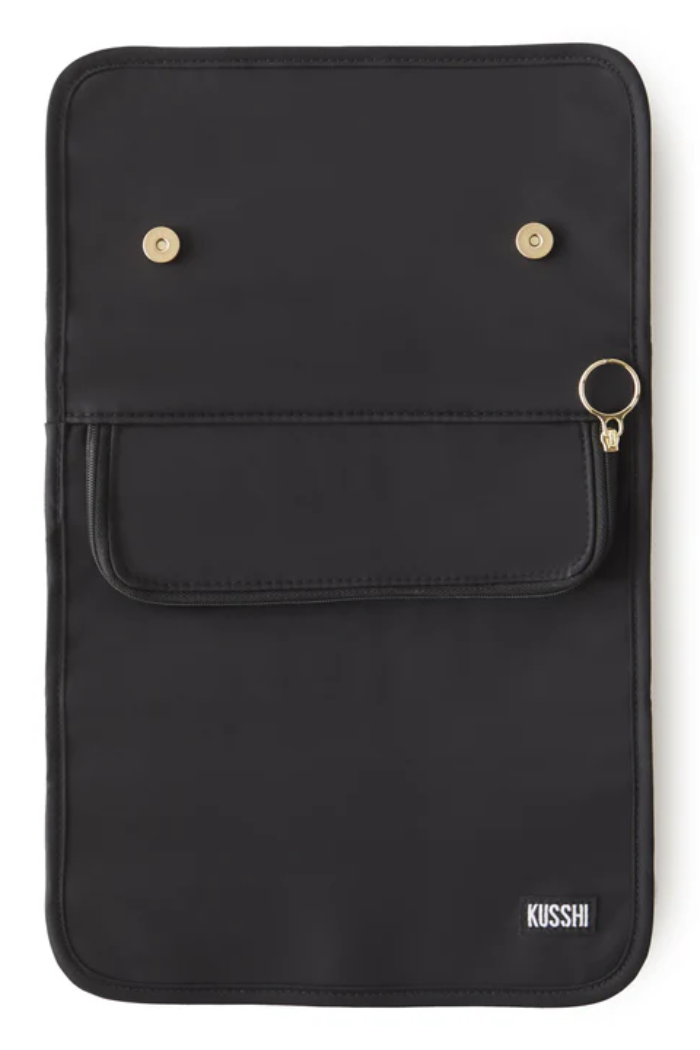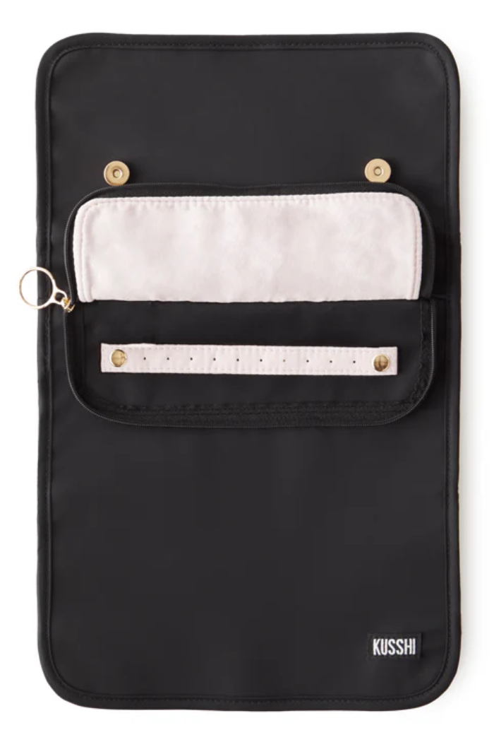 The KUSSHI Jewelry Organizer is crafted in a premium nylon black exterior with a blush micro-suede lining and magnetic closure to protect your most delicate keepsakes. The tri-fold design is compact enough for travel yet offers extensive storage solutions for your most valued pieces. A protected interior section with a variety of pockets, offers safekeeping for necklaces, rings, or bracelets, and a hideaway loop at the top can be used to hang your Jewelry Organizer at length for at-a-glance accessorizing. Available in two sizes, medium and large.