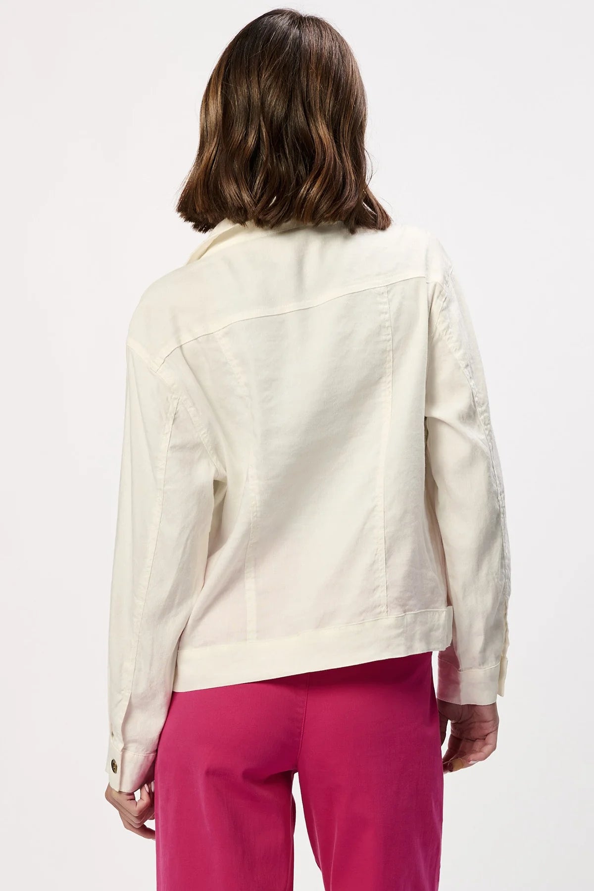 Unparalleled elegance with the Jocelyn shirt jacket, a button-front masterpiece crafted from a harmonious blend of 55% linen, 42% rayon, and 3% spandex for a breathable, yet perfectly structured fit. This essential piece offers polished versatility is an ideal choice for any occasion providing ultimate comfort in every wear.