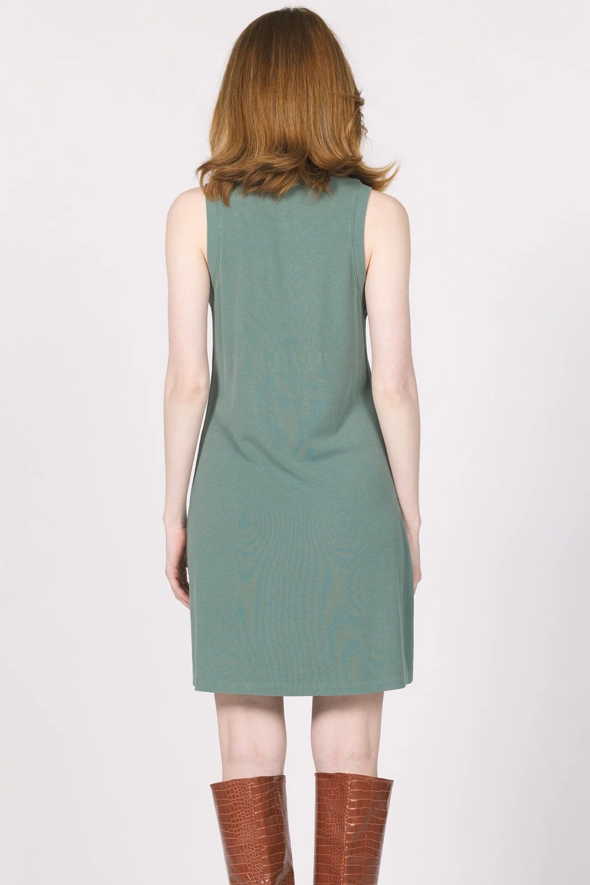 The Justin rib dress offers a sleek crew neck, sleeveless design with a comfortable, flattering classic fit. Perfect on its own or layered, it adds effortless elegance to any outfit.