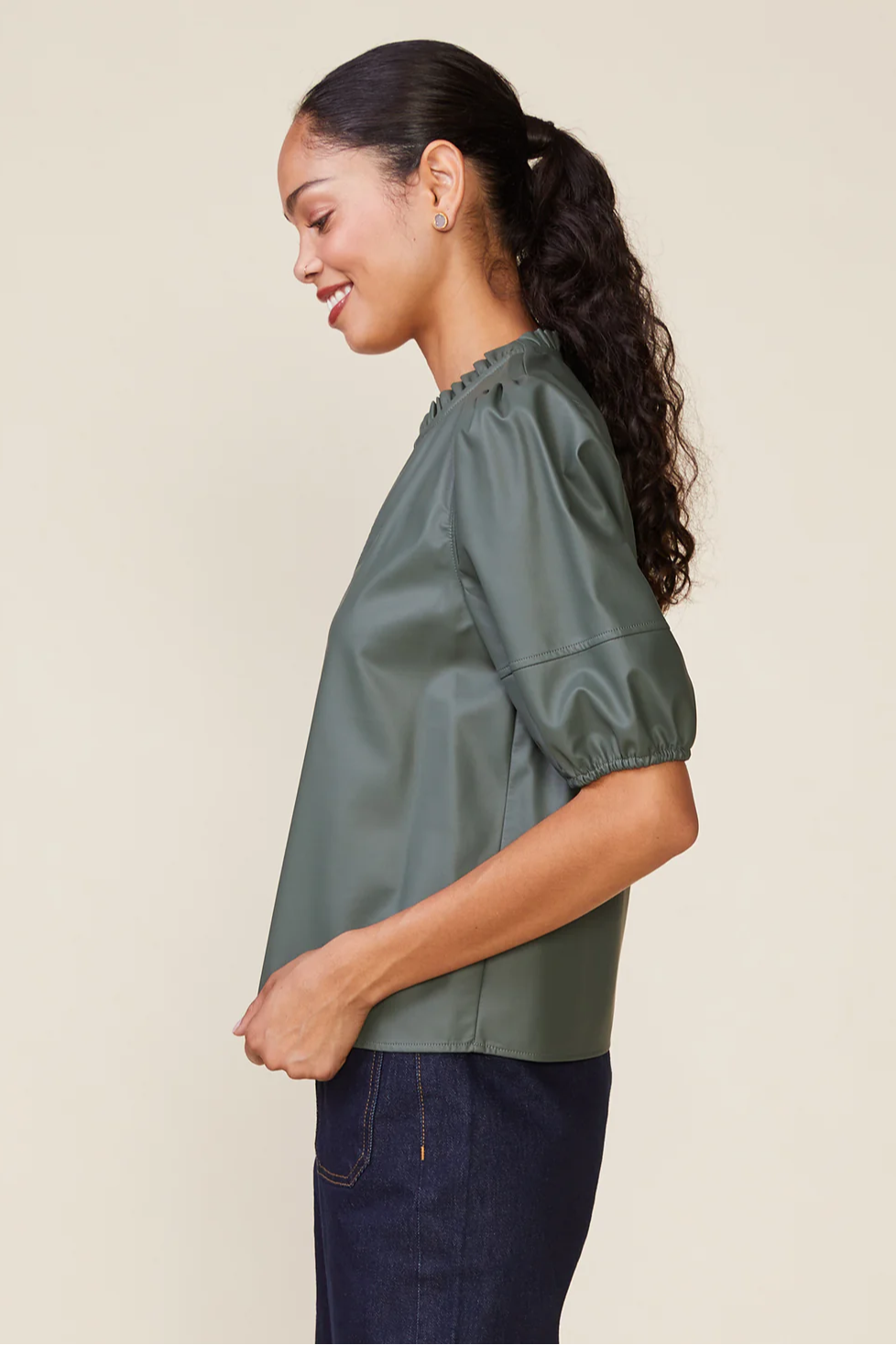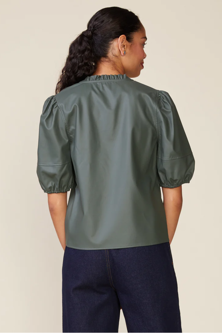 Meet the Kacey Vegan Leather Blouse—a bold blend of country charm and rock ‘n’ roll edge. Designed with a flattering V-neckline, a playful ruffled collar, and seamed puff sleeves, this femme-forward top exudes effortless confidence. Pair it with the *Morrison Vegan Leather Seam Midi Skirt* for a strikingly polished look that’s equal parts sass and sophistication.
